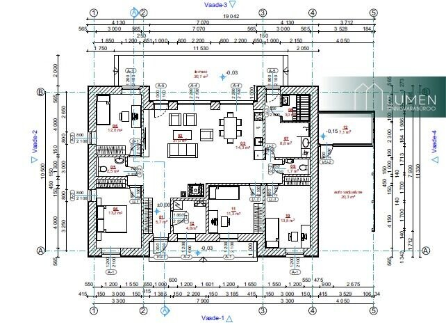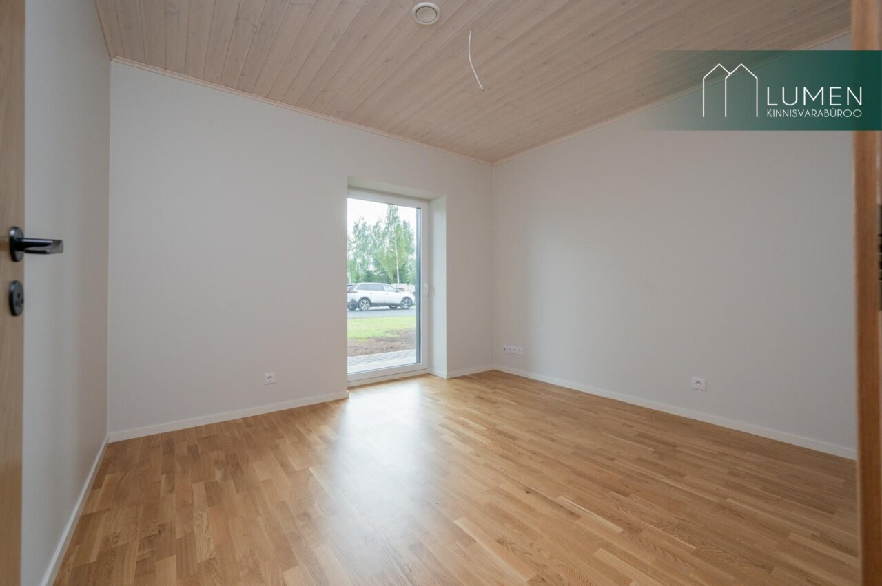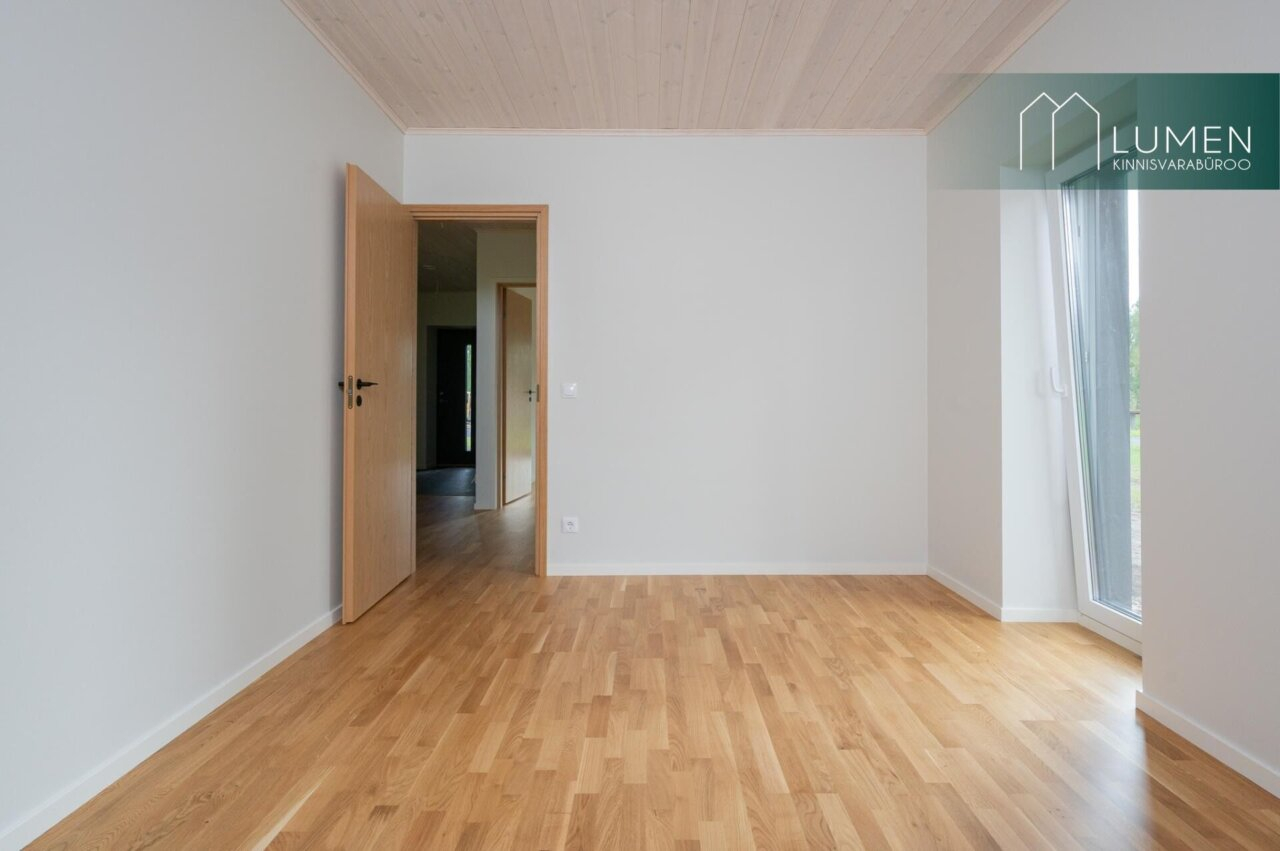 Elamu netopind on 128,9 m² ning see on nutikalt jaotatud viie toa vahel. Avar köök-elutuba (44,3 m²) moodustab kodu südame, kus on piisavalt ruumi nii pereõhtuteks kui ka külaliste võõrustamiseks. Elutoast pääseb otse suurele 30,1 m² terrassile, mis laiendab eluruumi õue. Kokku on majas neli magamistuba – kaks paremal ja kaks vasakul pool maja, pakkudes privaatsust ning mugavat peresõbralikku paigutust. Lisaks on majas kaks eraldi tualettruumi, pesuruum koos leiliruumiga, tehnoruum ja praktiline abiruum, kuhu pääseb otse auto varjualusest.