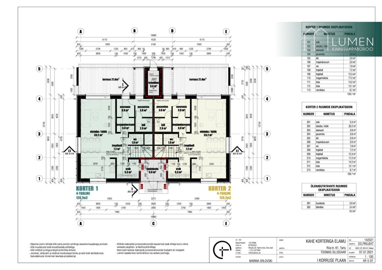 Köetav elamispind 126,7m². Koos terrassi (21,4m²), rõdu (5,5m²) ja välise panipaigaga (8,4m²) on kogupind kokku lausa 162m²!