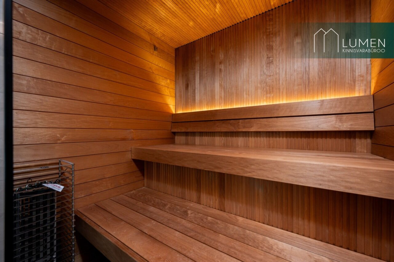 Sauna leiliruum on viimistletud puitlaudisega ning paigaldatud on Huum elektrikeris.