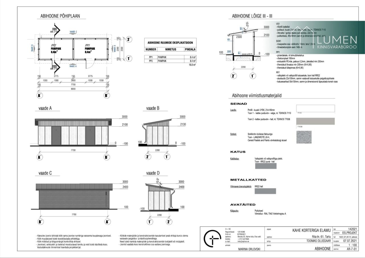 Välisseinad on laotud Fibo 200 plokkidest ja soojustatud kingspan plaadiga. Siseseinad on laotud Fibo 100 plokkidest. Korterite vaheline sein Columbia 240 plokkidest. Hoonel on plekkkatus. Lae soojapidavuse tagab puistevill.