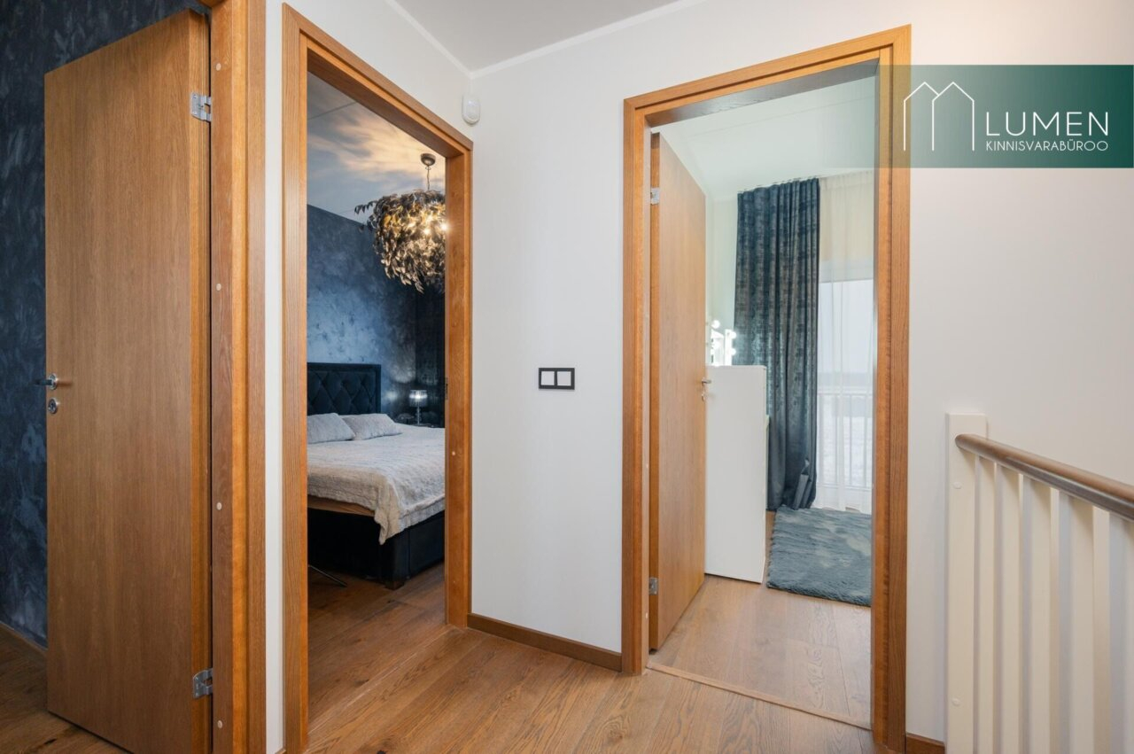 Teisele korrusele viib tammepuidust trepp. Seal paiknevad kolm magamistuba ning wc-dušširuum. Kahest magamistoast pääseb avarate vaadetega rõdule.