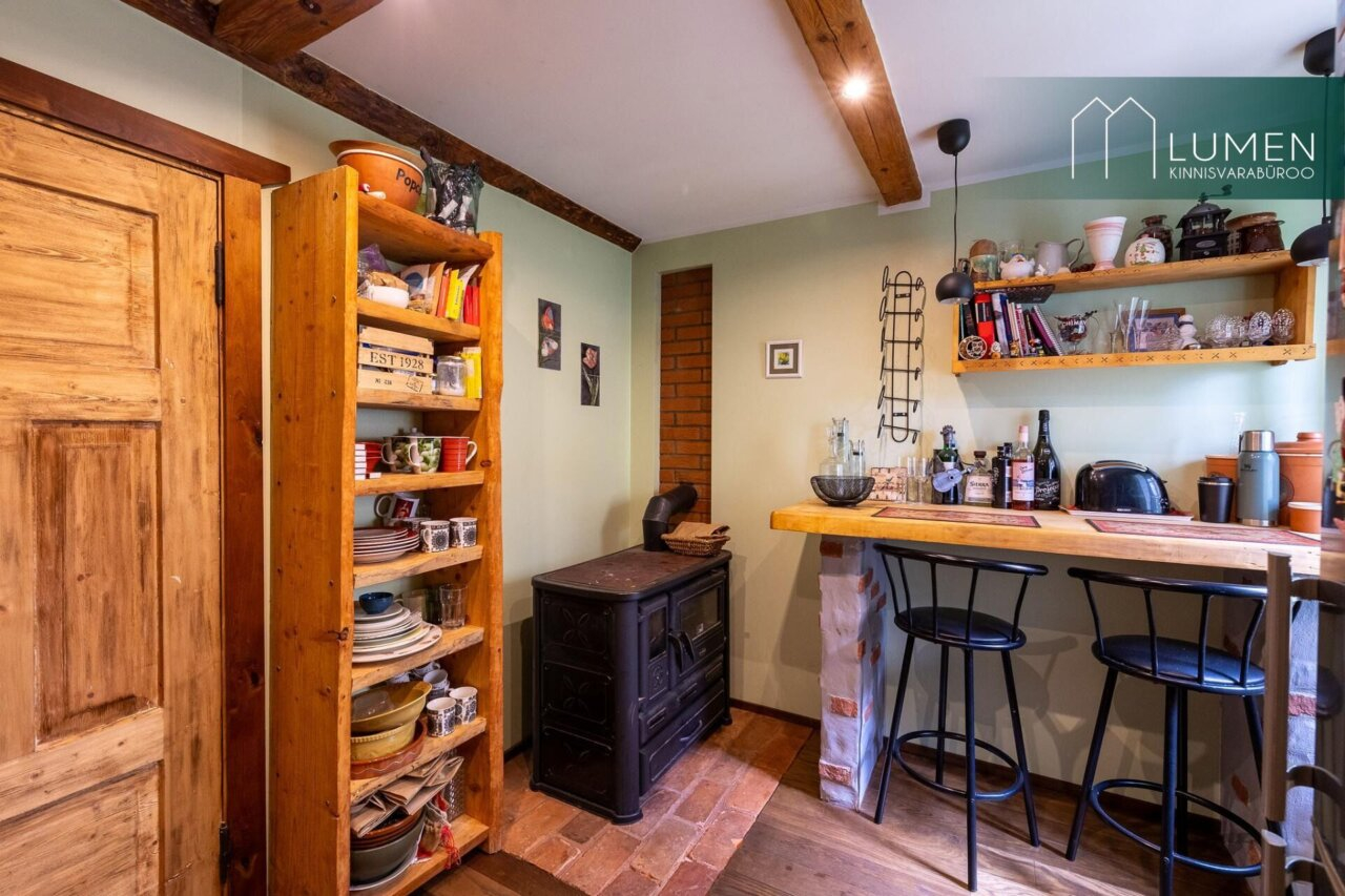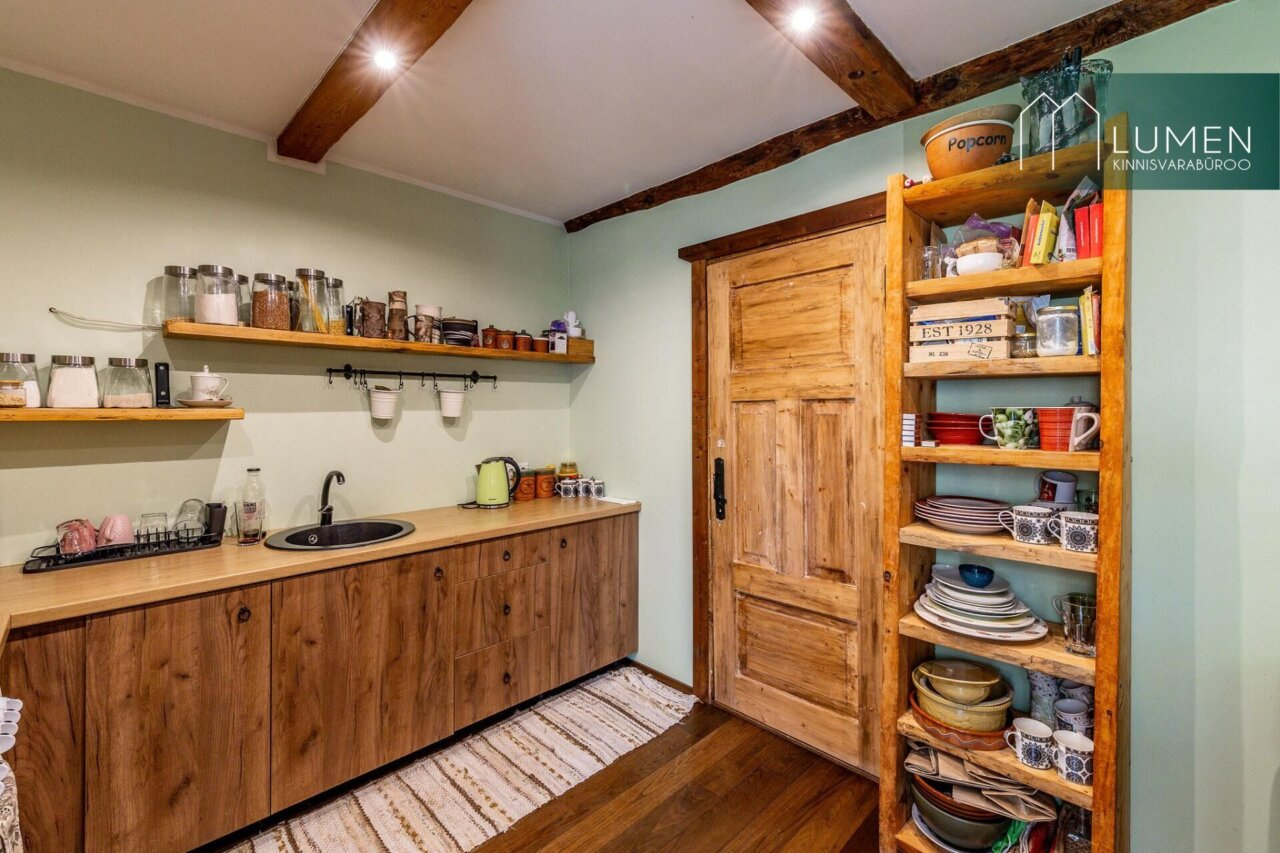 Koridorist teine uks paremale juhatab kööki. Köögi põrandaid katab termotamme naturaalne parkett. Süüa saab valmistada kas mugavalt gaasipliidil või siis hoopis puupliidil.
