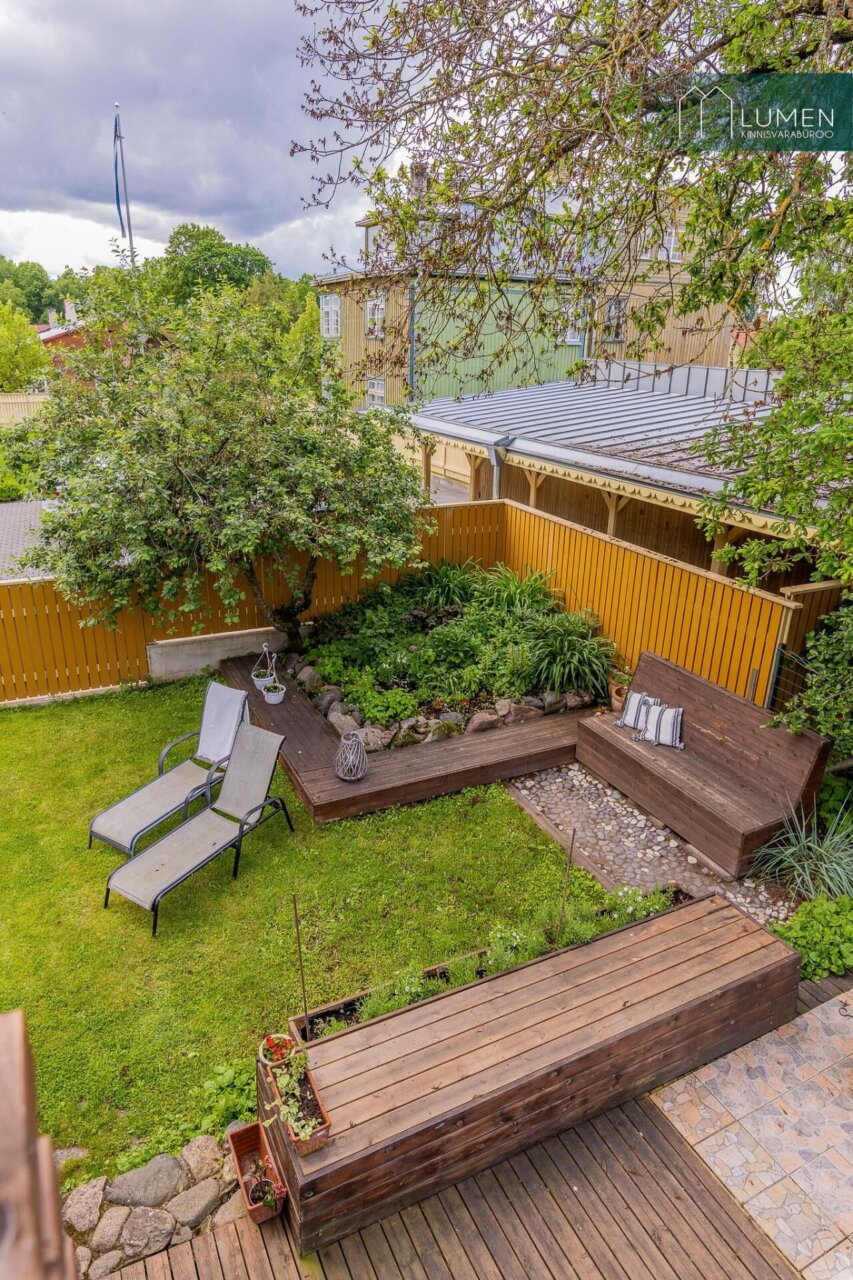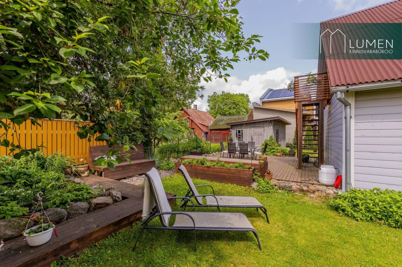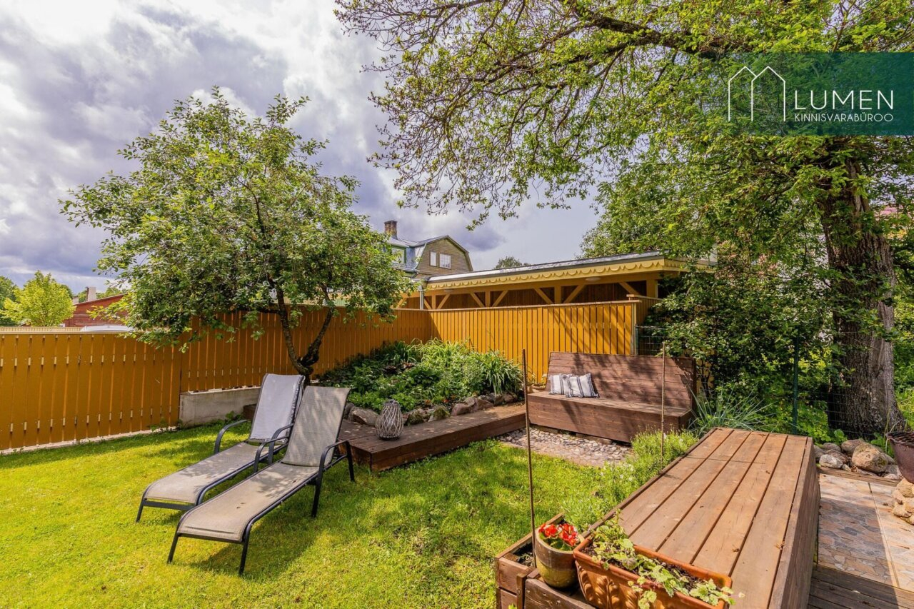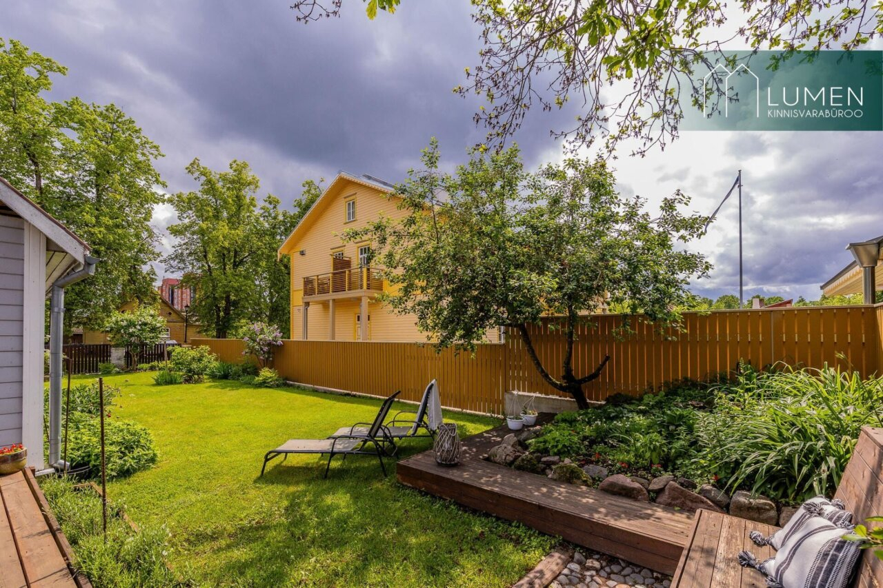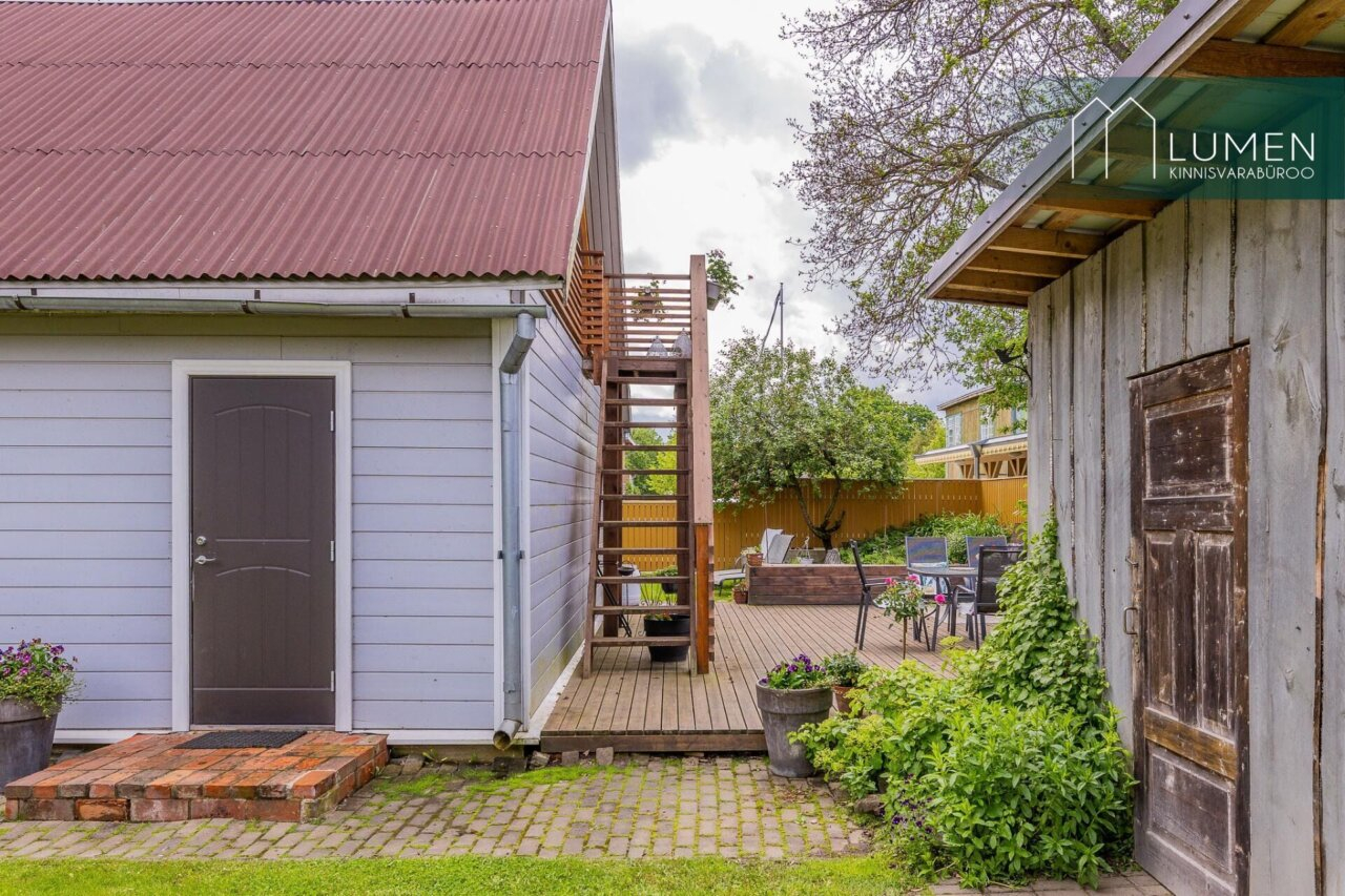 523 m² suurune kinnistu jaotub maja paremale ja vasakule küljele ning maja taha, kus asub 40 m² suurune päikese- ja valgusküllane terrass, mis asub vana vundamendi osa peal. Maja sissekäigu teel on punane tänavakivi.