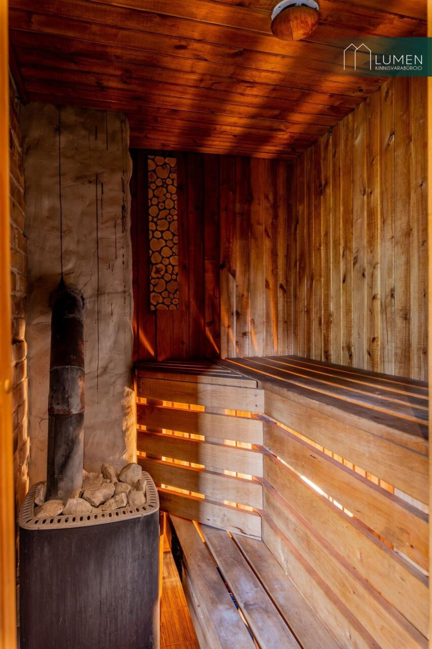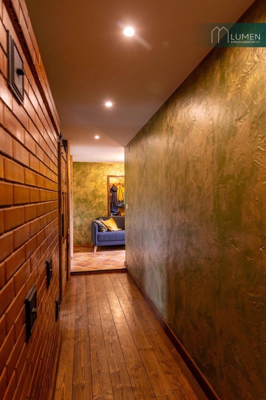 Koridori lõpus on avar elutuba, mis on loodud ajastutruult, toodud sisse ka kaasaegseid elemente. Elutoas on ka kütteallikad – ahi ning õhk-soojuspump, millel on ka jahutus.