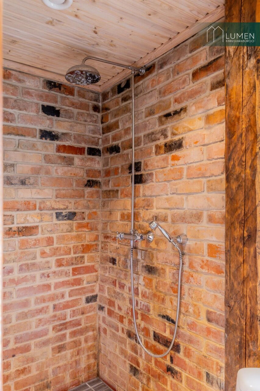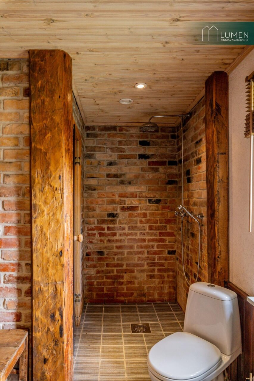 Majja sisenedes jõuame esikusse, mille põrandat katab keraamiline plaat. Esikust kohe otse jäävad kaks panipaika. Vasakule pöörates jääb piklik koridor, mida mööda pääseb muudesse tubadesse ja ruumidesse elumajas. Koridorist esimene uks vasakule viib avarasse vannituppa, kus asub ka wc ning puuküttekerisega saun. Vannitoas on põrandaküte ning valmidus vanni paigaldamiseks. Kivisein dušši taga, on selle maja algsetest kividest. Saun ja vannituba on mõõtudelt 24 m². Vannitoas on olemas ka puuküttega ahi, mis läheb väga kiiresti soojaks ja on samuti maja kütteallikaks.