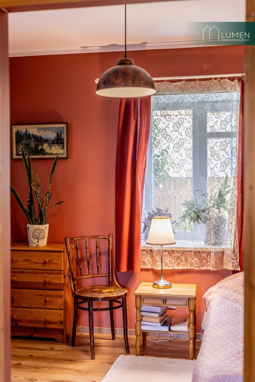 Elutoast läbi minnes, pöörates paremale jääb teine magamistuba, mille üheks seinaks on uue viimistluse saanud antud maja vana põranda lauad.