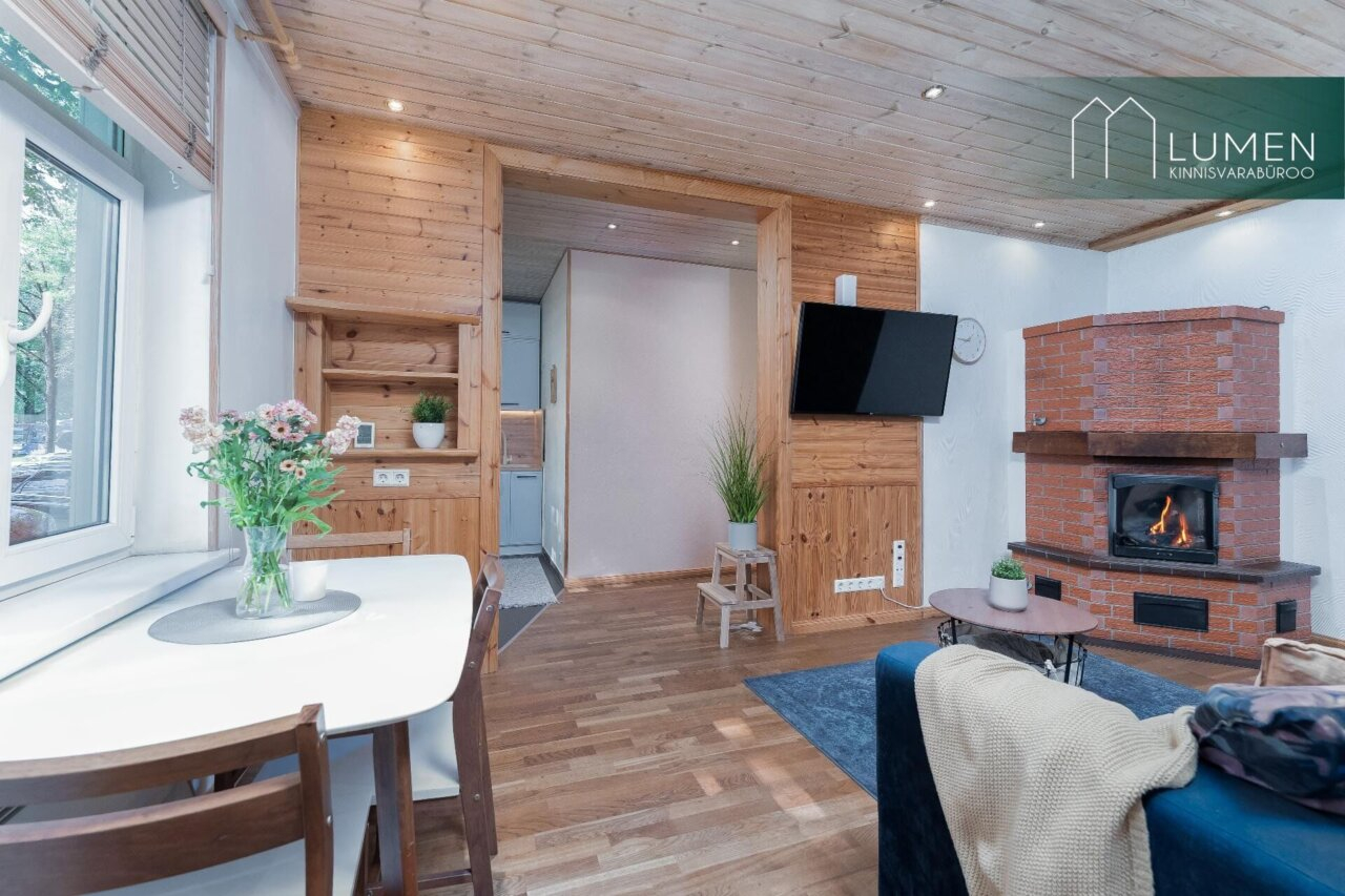 Korteris on avatud köögiga elutuba, kaks magamistuba, vannituba/wc, esik. Lisaks kuulub korteri juurde kuuriboks. Kõigist korteri akendest avaneb vaade parki. Elutoa südameks on kaunis punastest tellistest kaminahi, mis loob hubase ja romantilise atmosfääri pimedatel õhtutel. Lisaks on olemas ahi ja elektriradiaatorid, et soojus oleks alati tagatud.