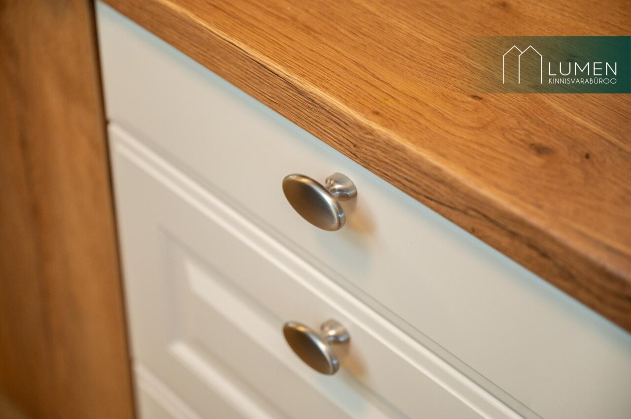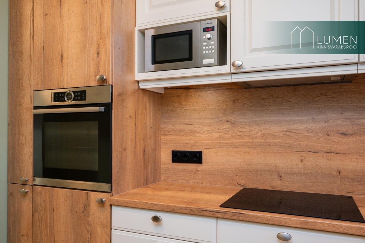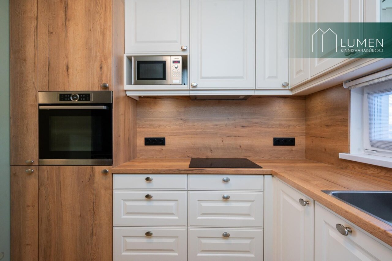 Köögis on kvaliteetne Häcker köögimööbel koos integreeritud tehnikaga ning põrand on kaetud vinüülparkettiga.