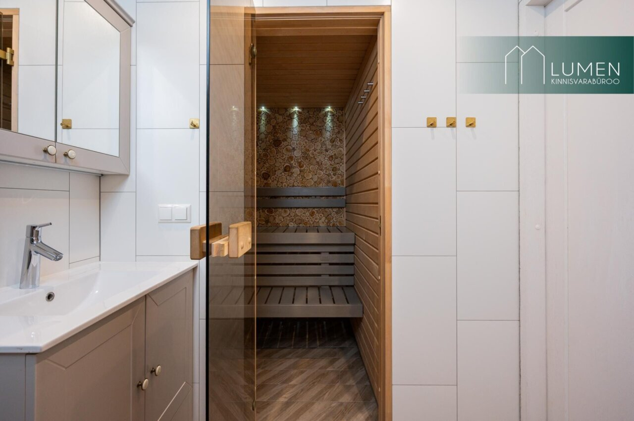 Esikust paremale jääb esimese korruse WC-dušširuum koos sauna ja eraldi panipaigaga.