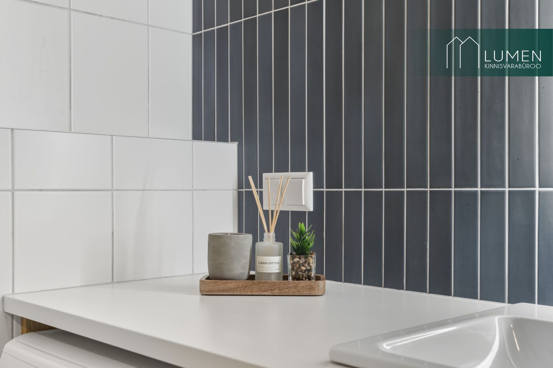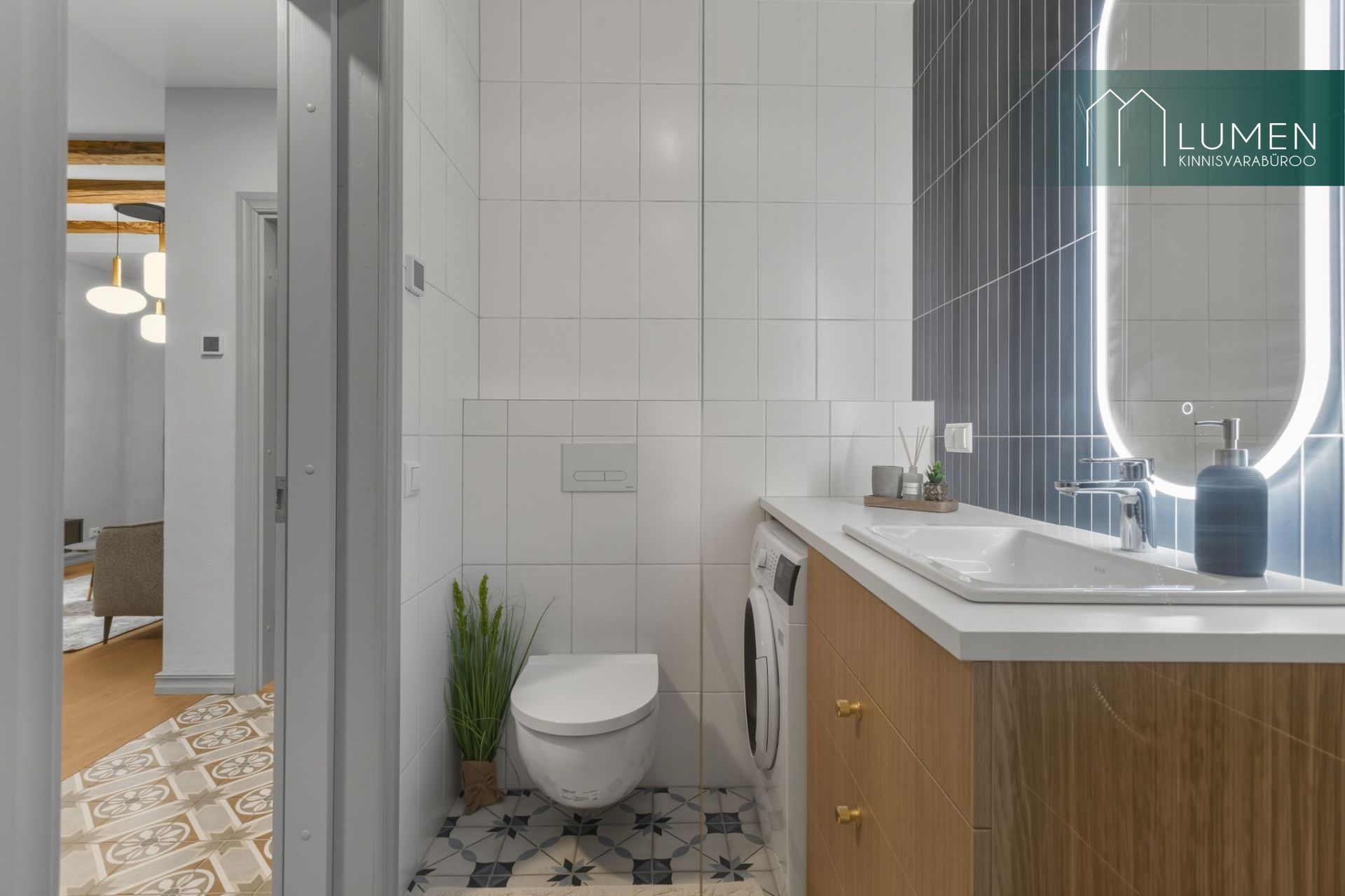 WC-duširuum on stiilne ja läbimõeldud, eriilmelised plaadid, pinnapealne valamu, peegel, mahukas kapp ning pesumasin on kõik olemas.