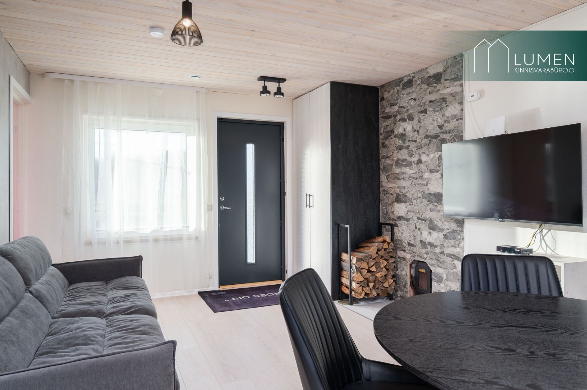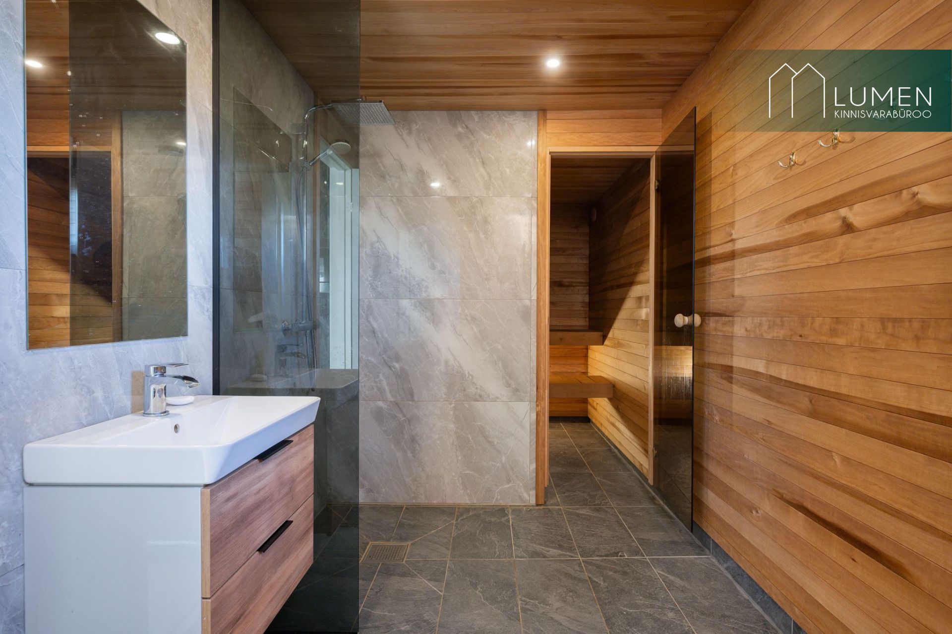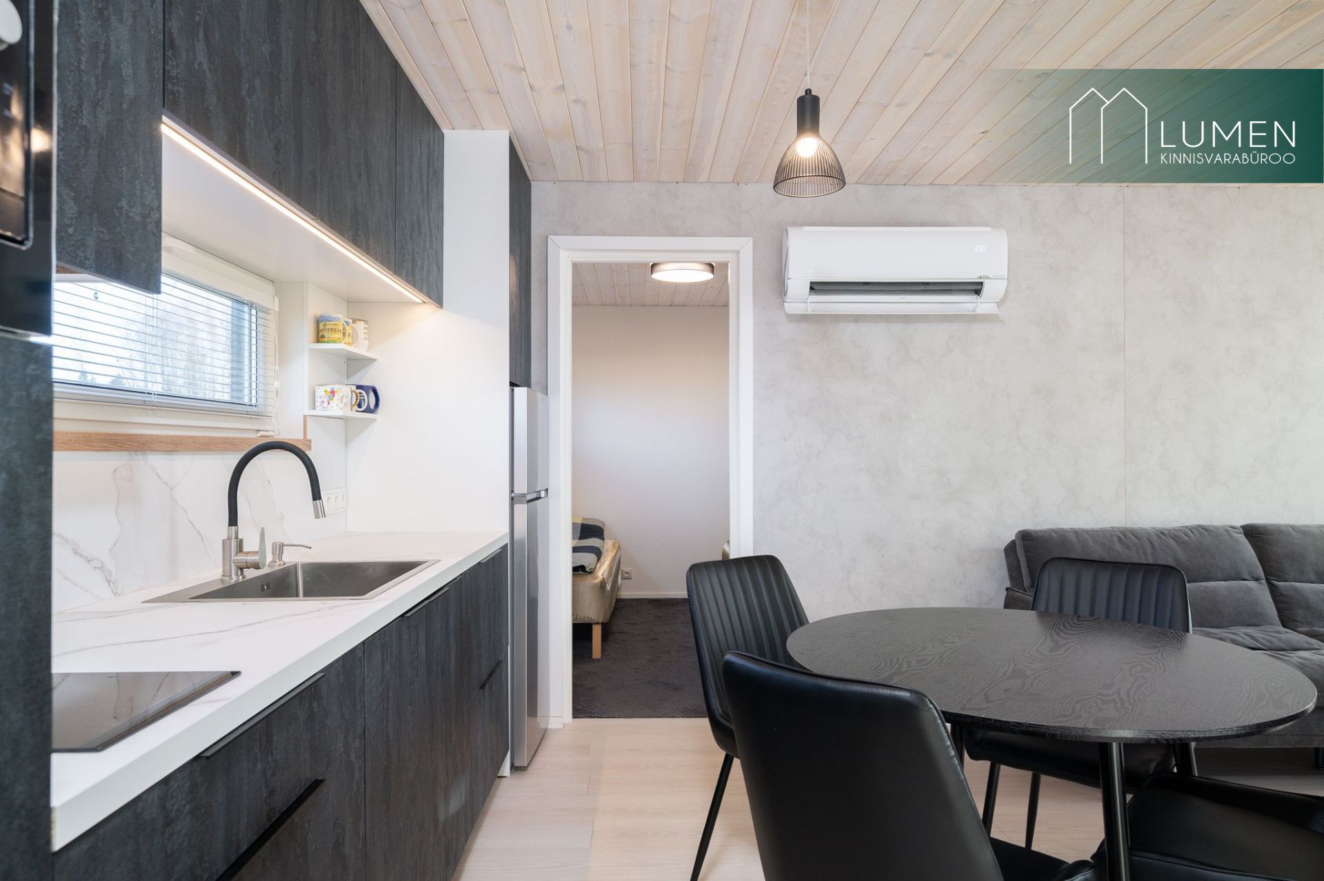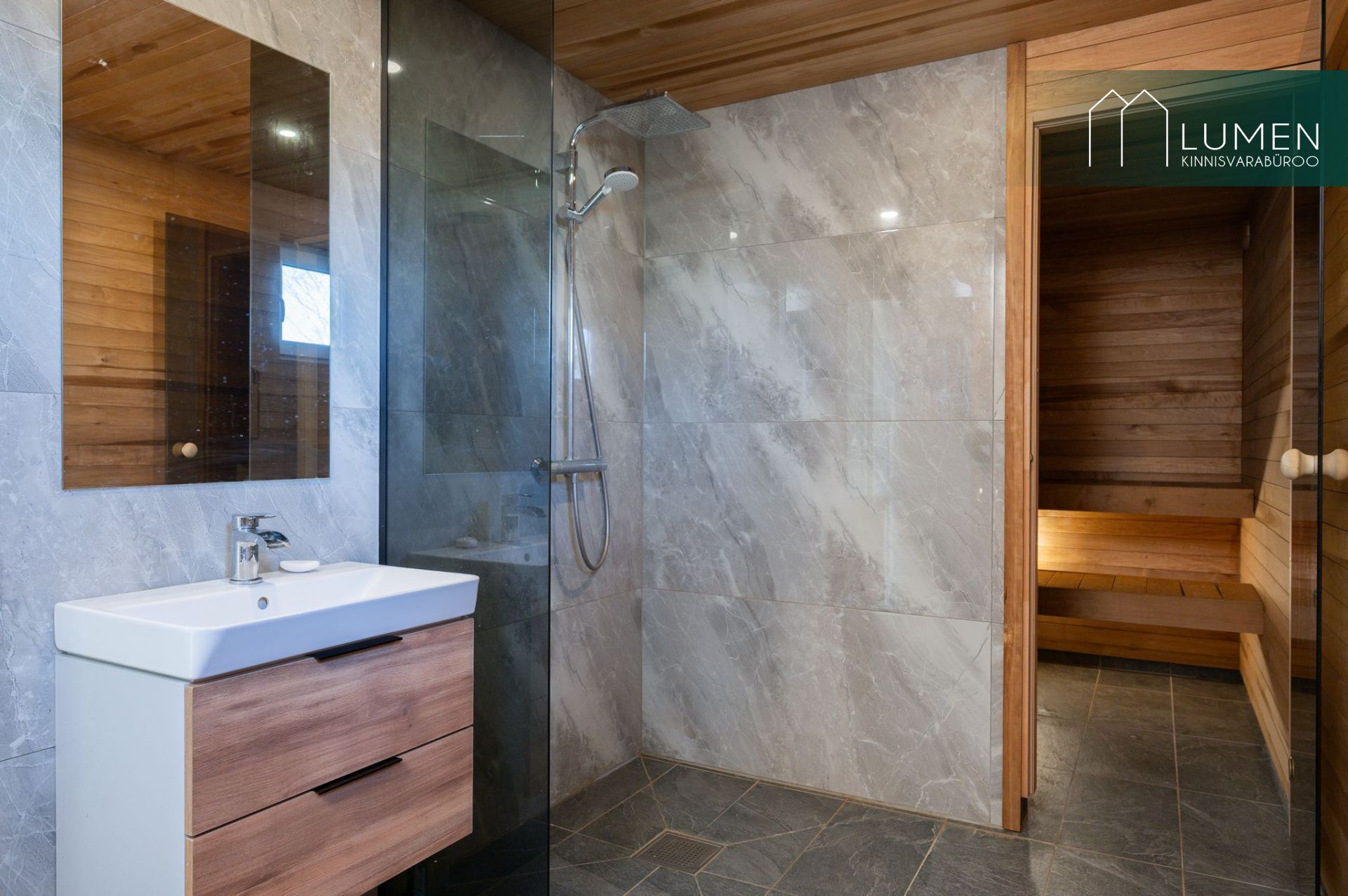 Avatud köögiga elutuba ning duširuum koos saunaga. Saun on puuküttega.