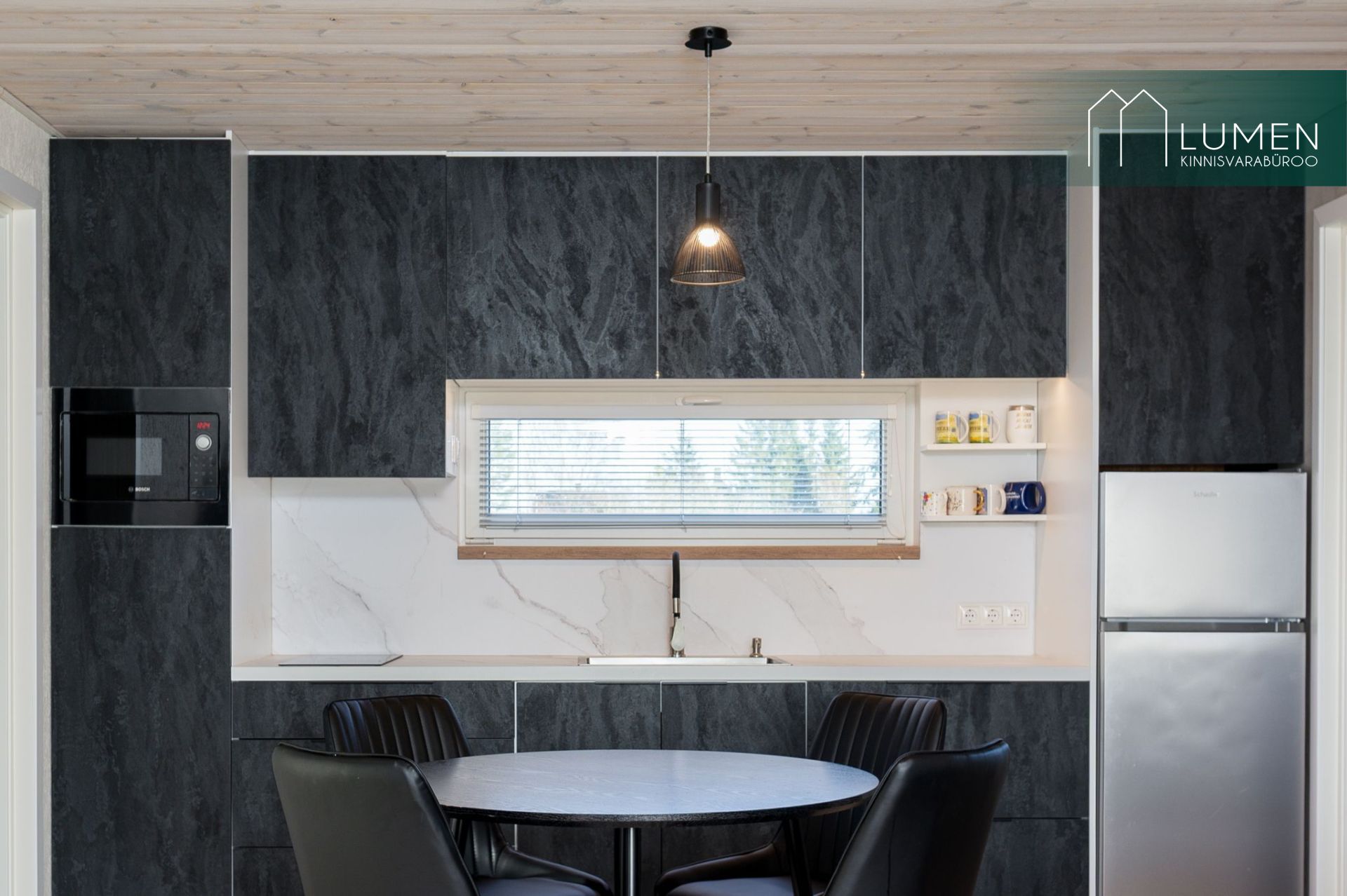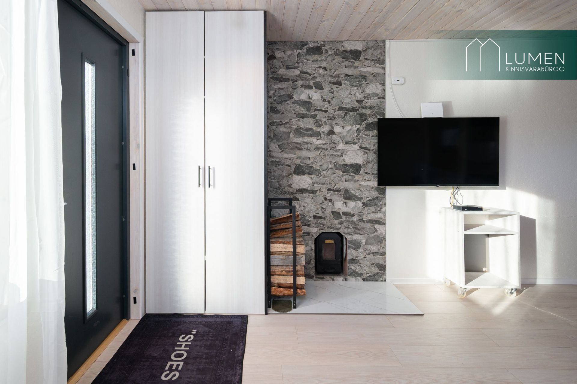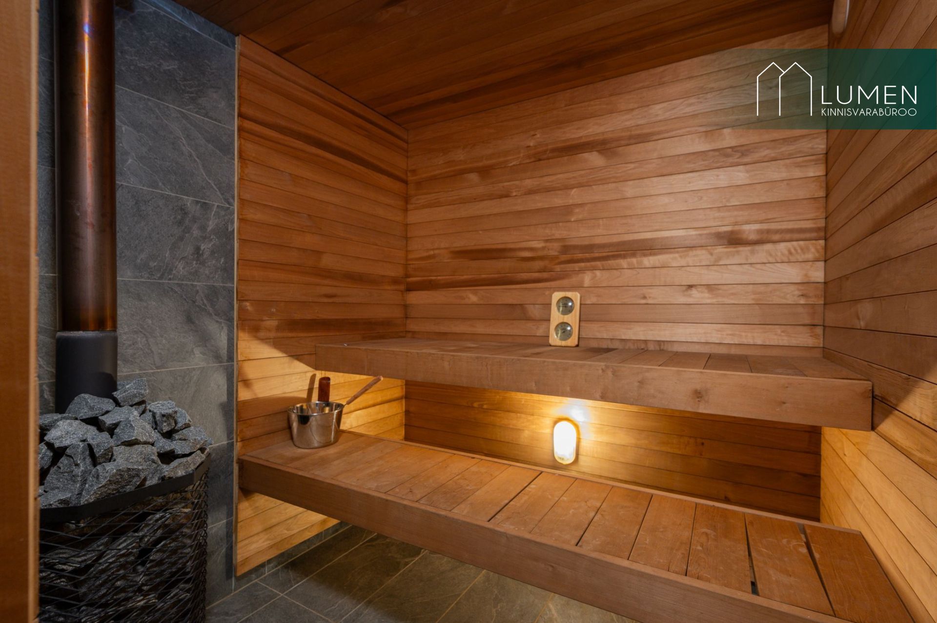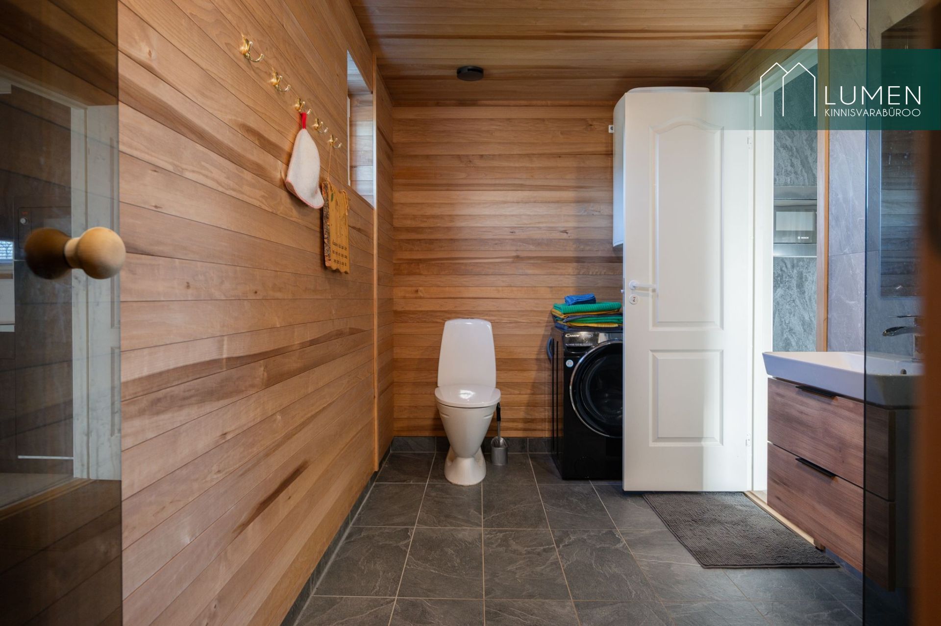 Avatud köögiga elutuba ning duširuum koos saunaga. Saun on puuküttega.