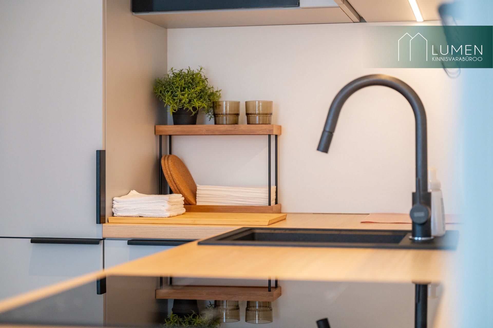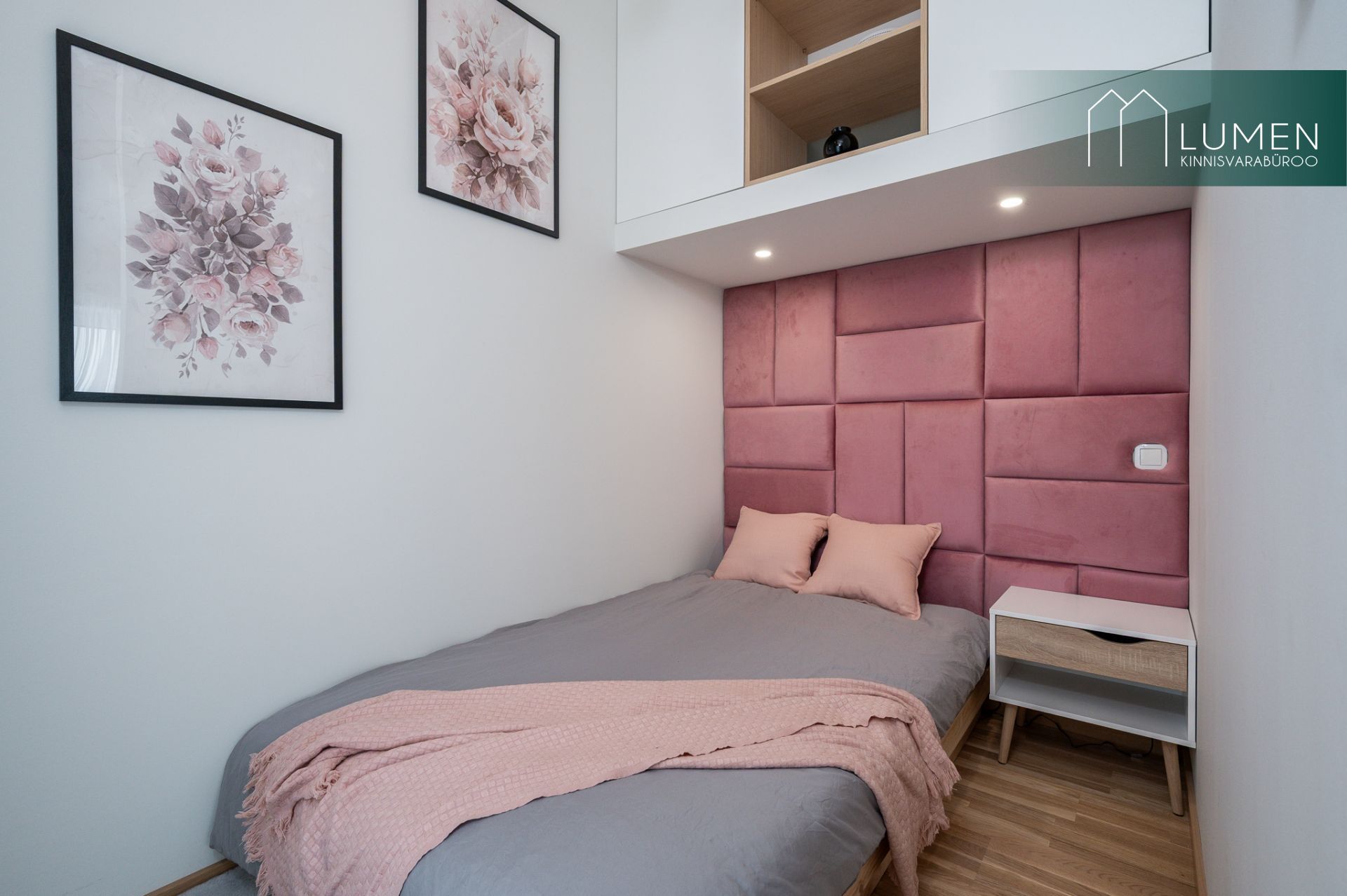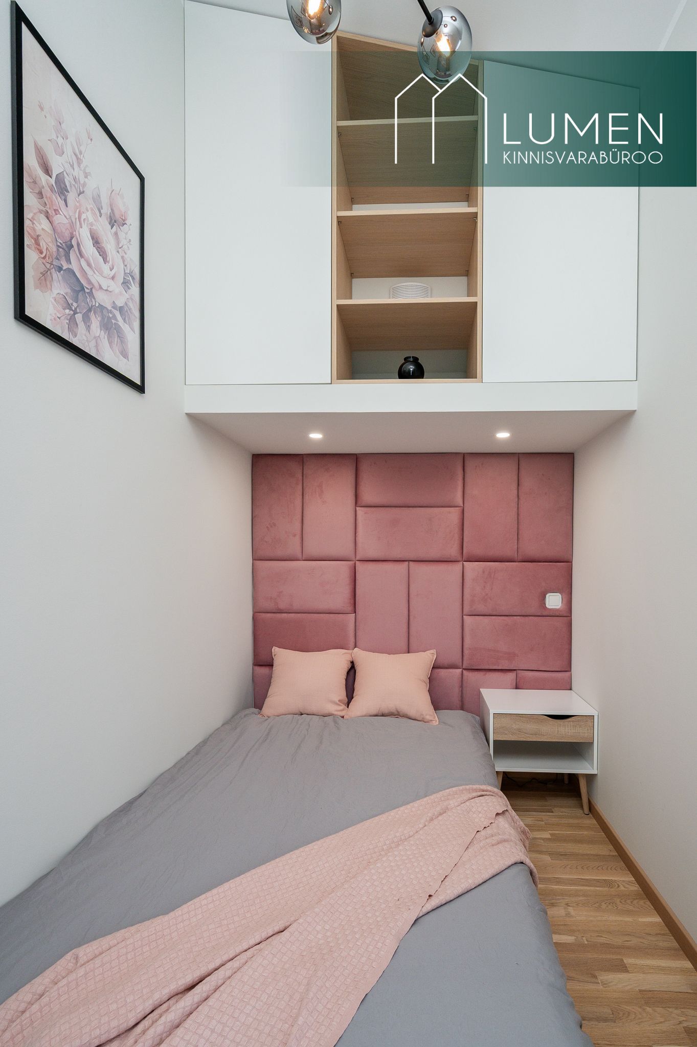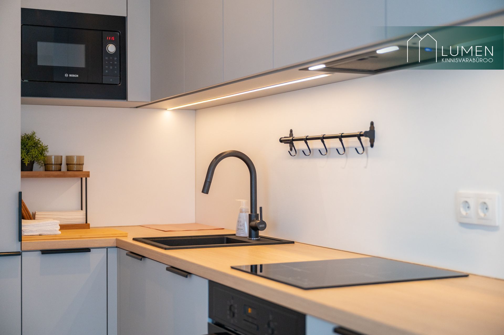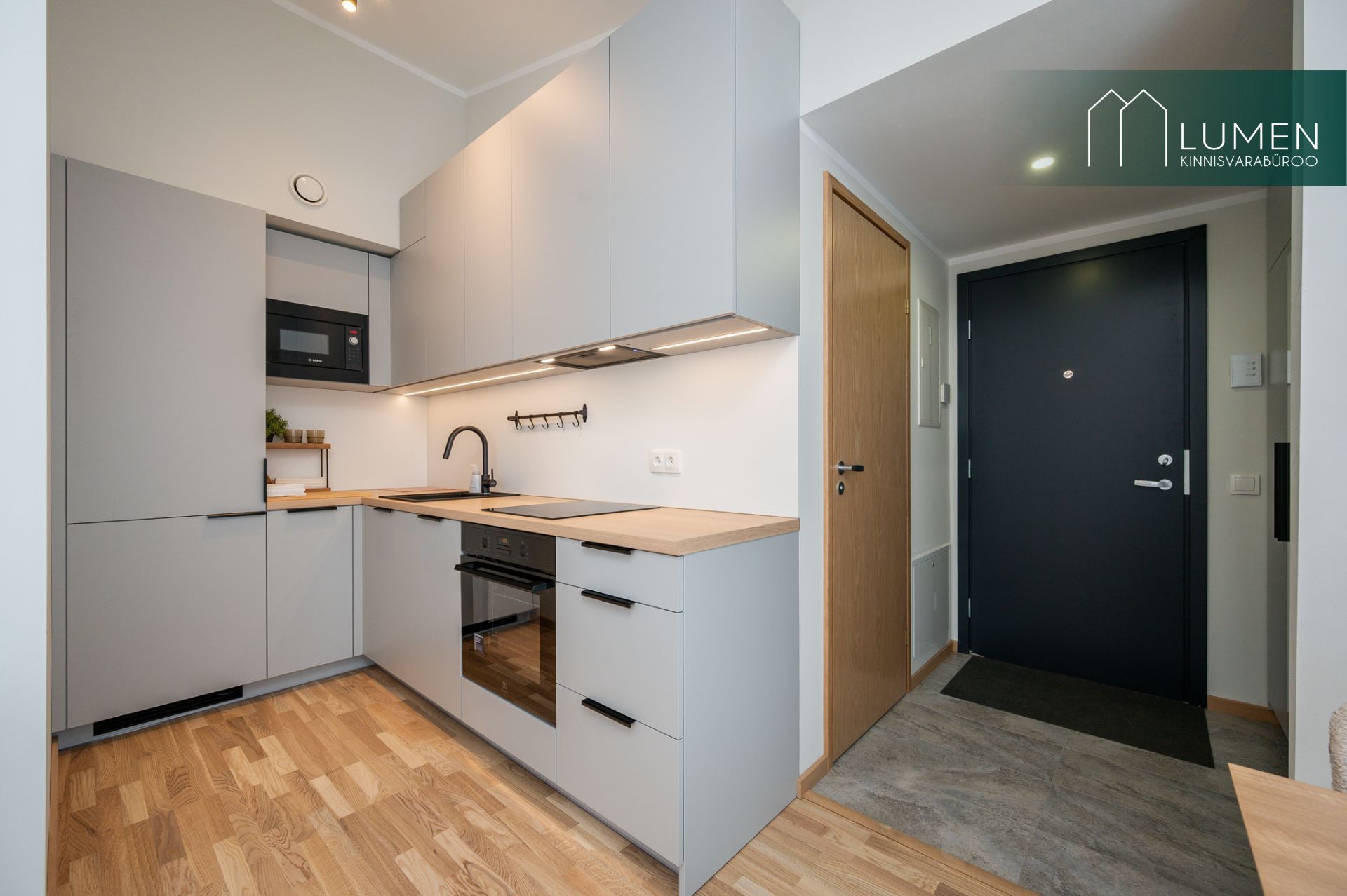 tehnikaga (ahi, induktsioonpliit, õhupuhasti, nõudepesumasin, külmik). Eritellimusel on valminud ka voodi kohal olev mahukas seinakapp.