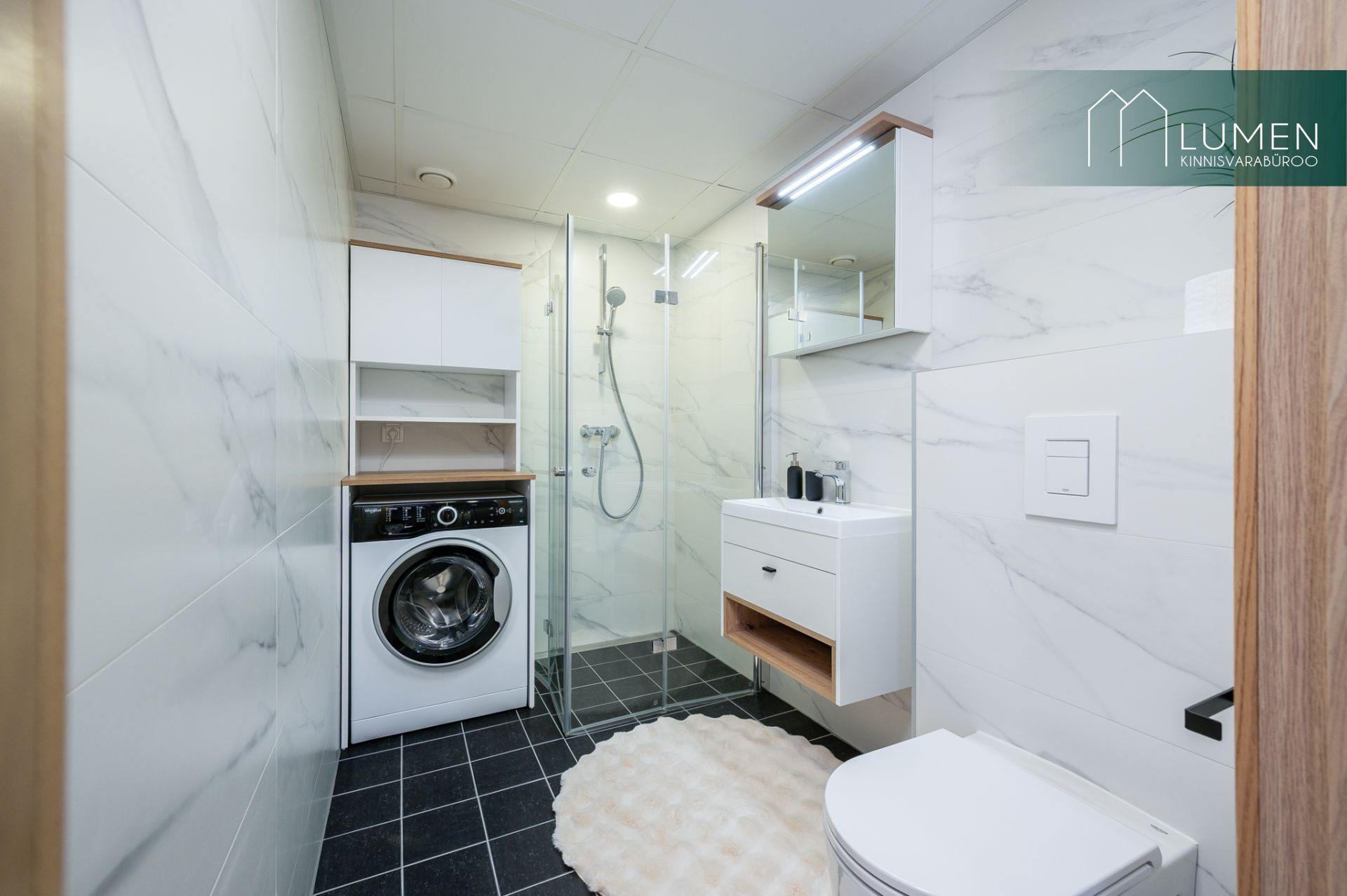 Korter on äsja valminud ja uhiuus. Põrandaid katab naturaalne tammeparkett.(Forte, valge, matt lakk) Seinad värvitud heledates pastelsetes toonides. Esiku- ja duširuumi põrand plaaditud.