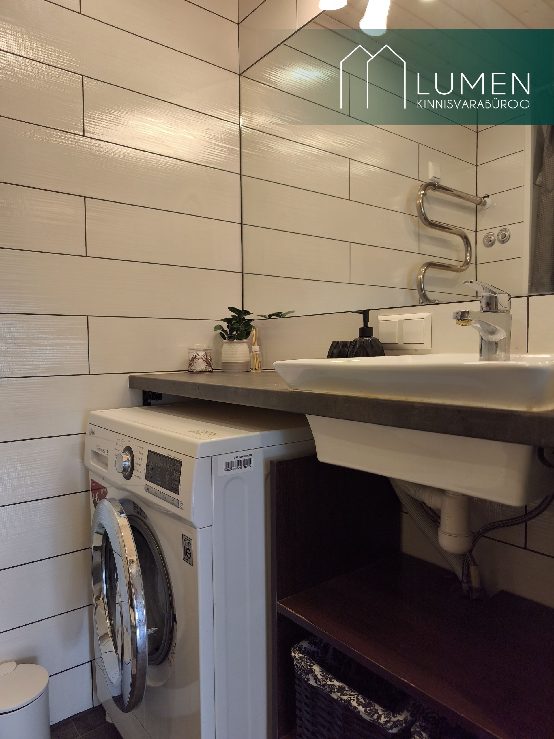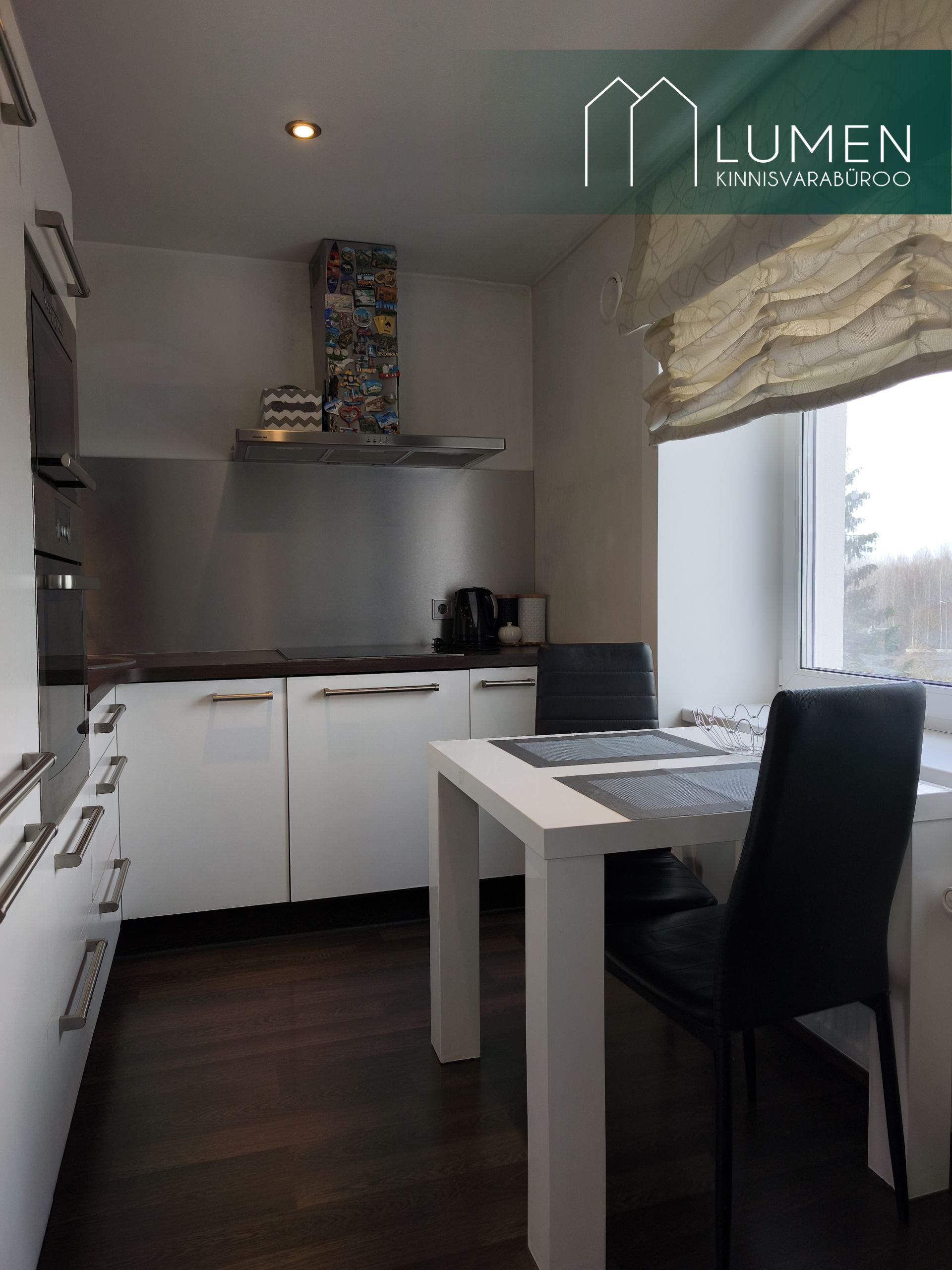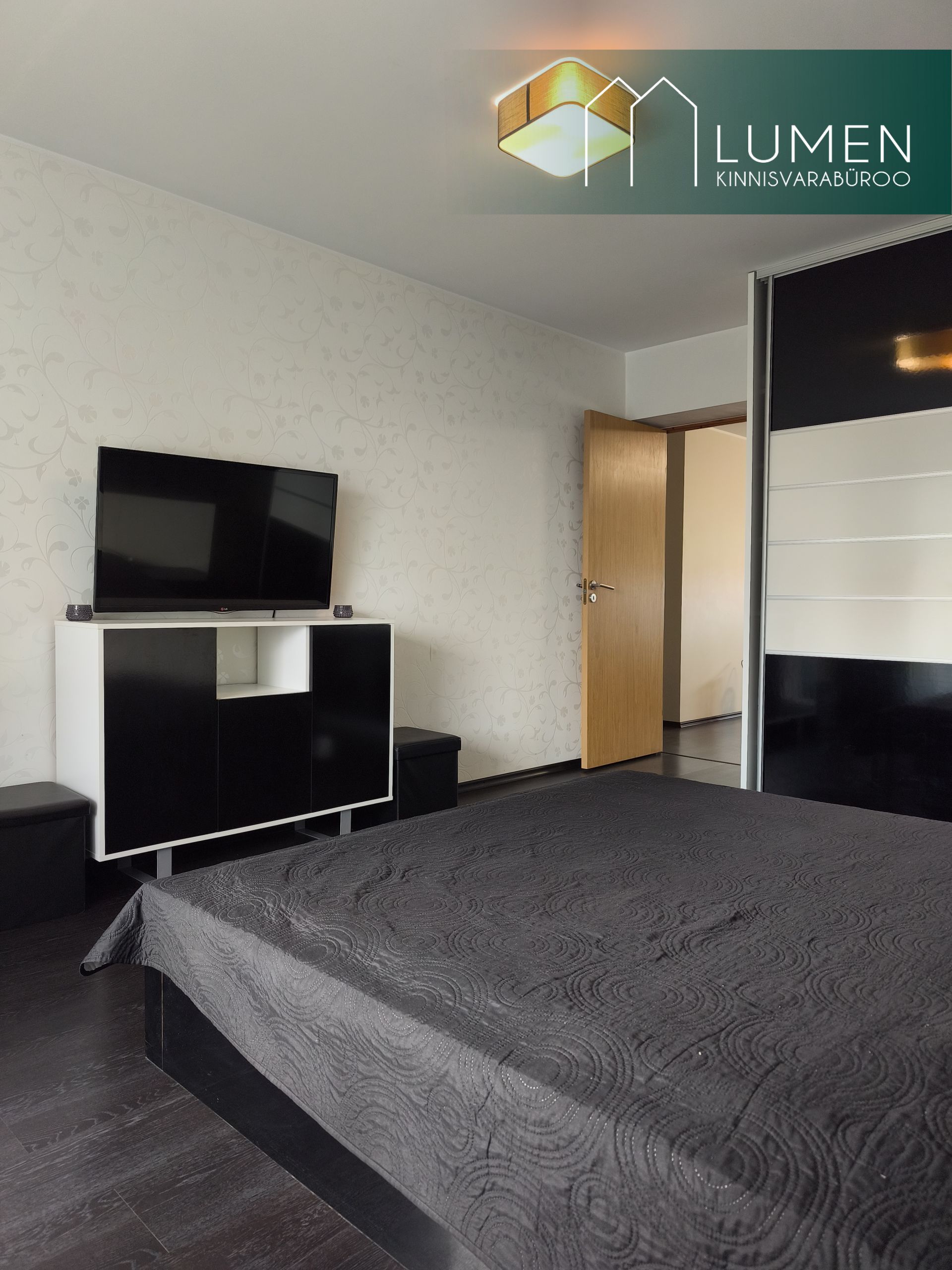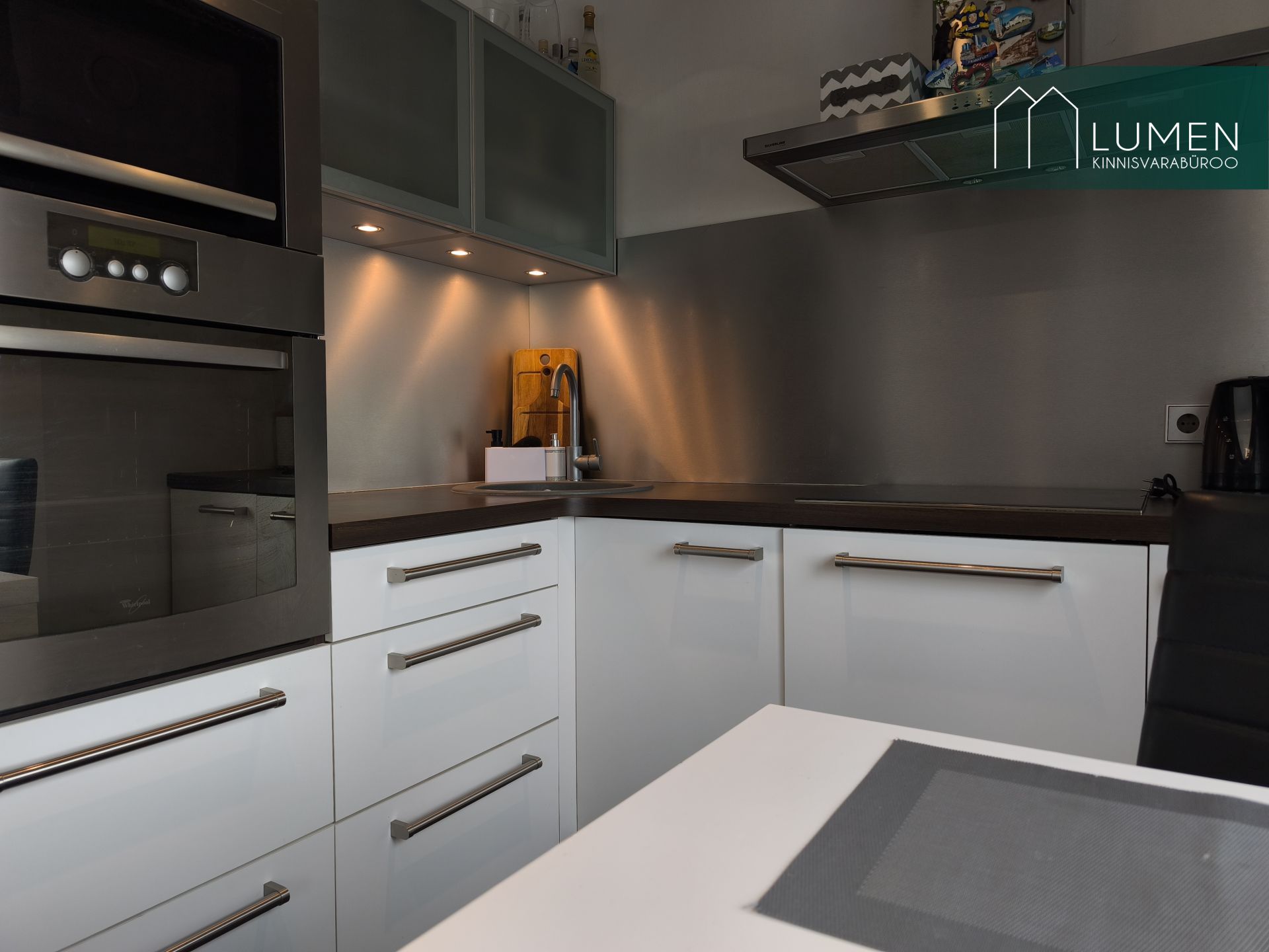 Köök on varustatud kogu vajaliku tehnikaga-pliit, külmkapp, praeahi, mikrolaineahi ja nõudepesumasin. Vannitoas on pesumasin. Korterisse jääb piltidel olev elu- ja magamistoa mööbel. Korteris on soe vesi tsentraalne.