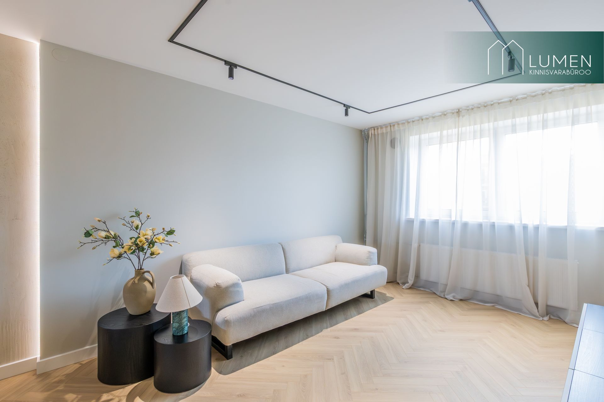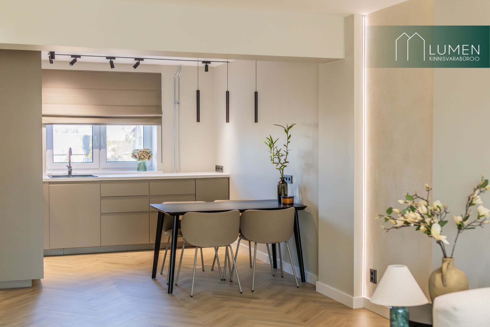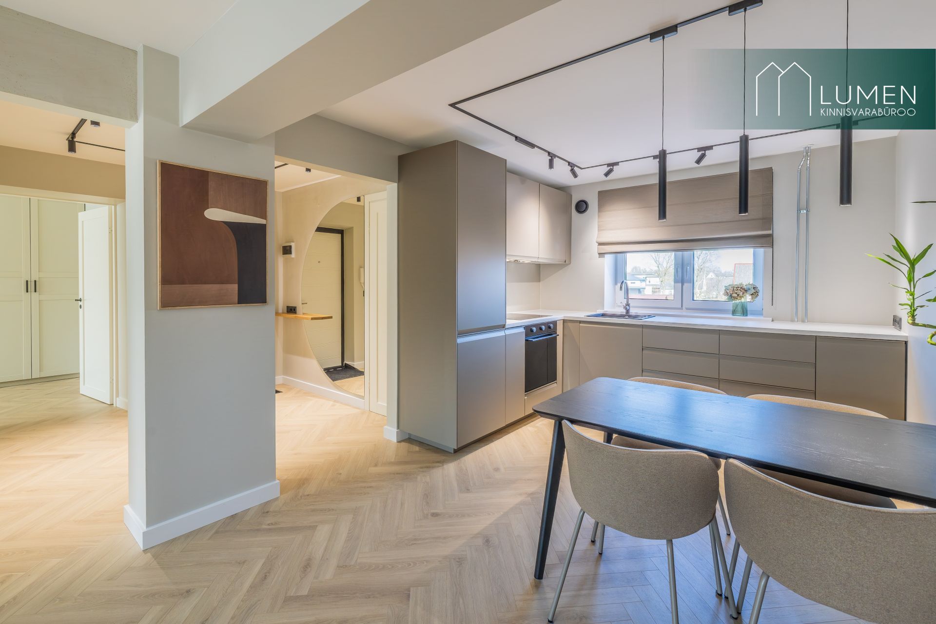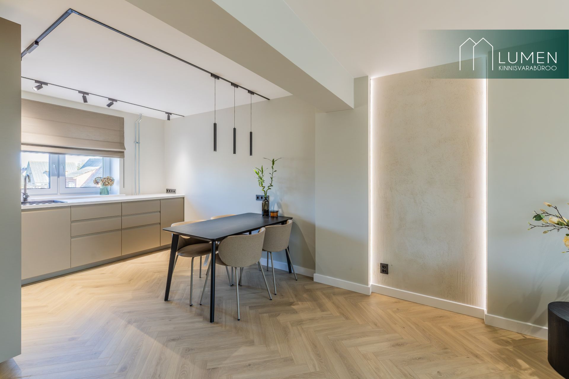 Korteri interjöör on loodud modernset elegantsi silmas pidades – naturaalsed toonid, kvaliteetsed materjalid ning minimalistlik, kuid soe disain loovad ajatu ja luksusliku atmosfääri. Avar elutuba koos köögiga moodustab kodu südame, kus suured aknad toovad sisse rohkelt loomulikku valgust ning rõhutavad ruumi avarust. Köök on kaasaegne ja funktsionaalne, varustatud integreeritud tehnikaga ning sobib ideaalselt nii igapäevaseks kasutamiseks kui ka külaliste võõrustamiseks.