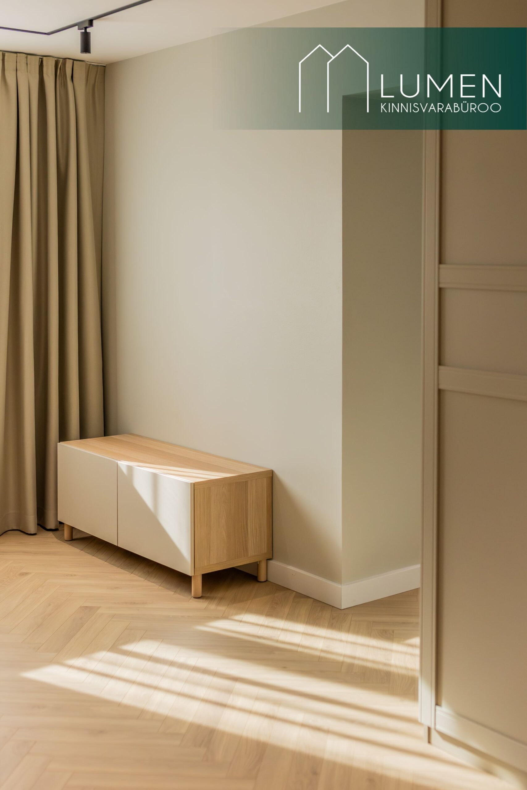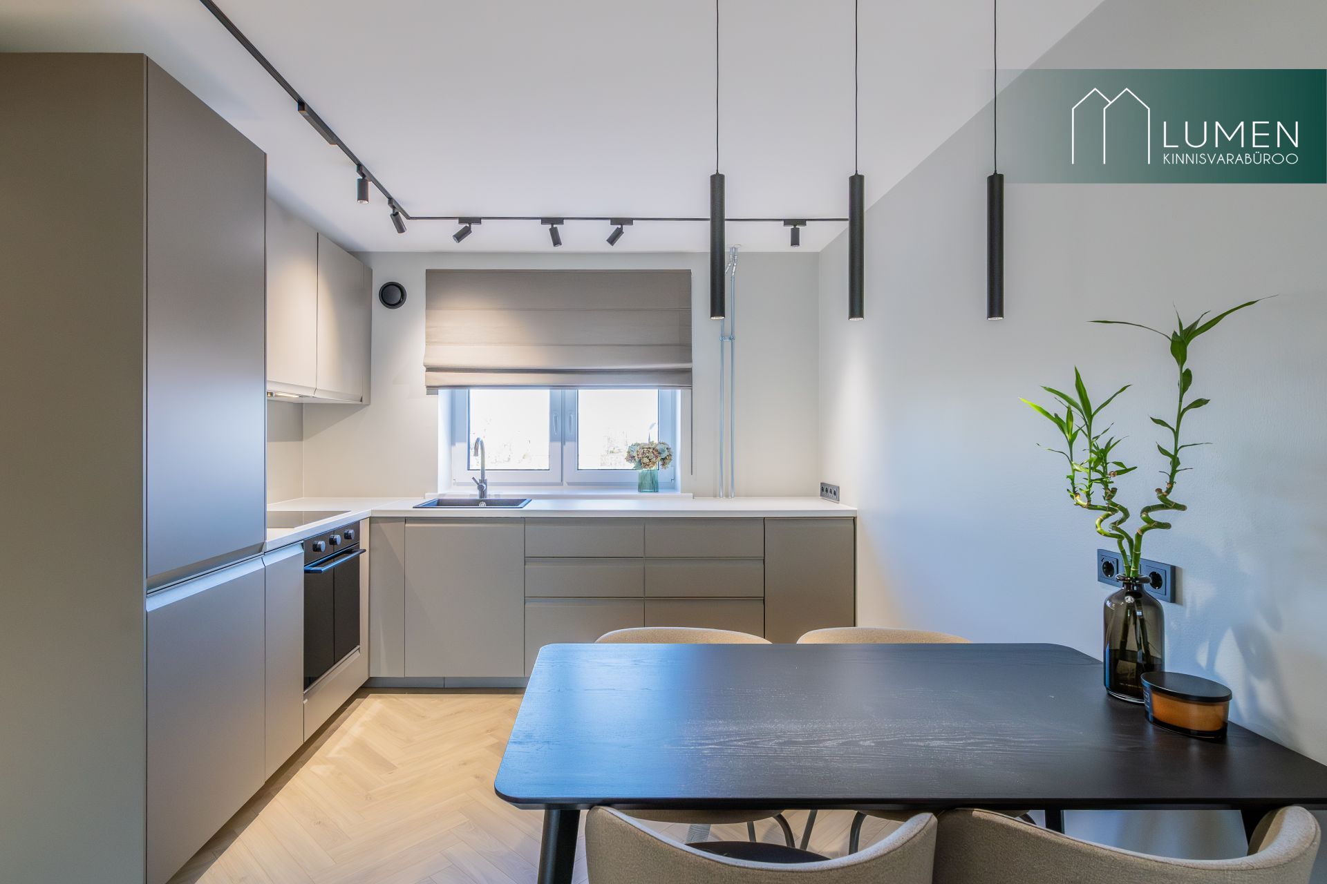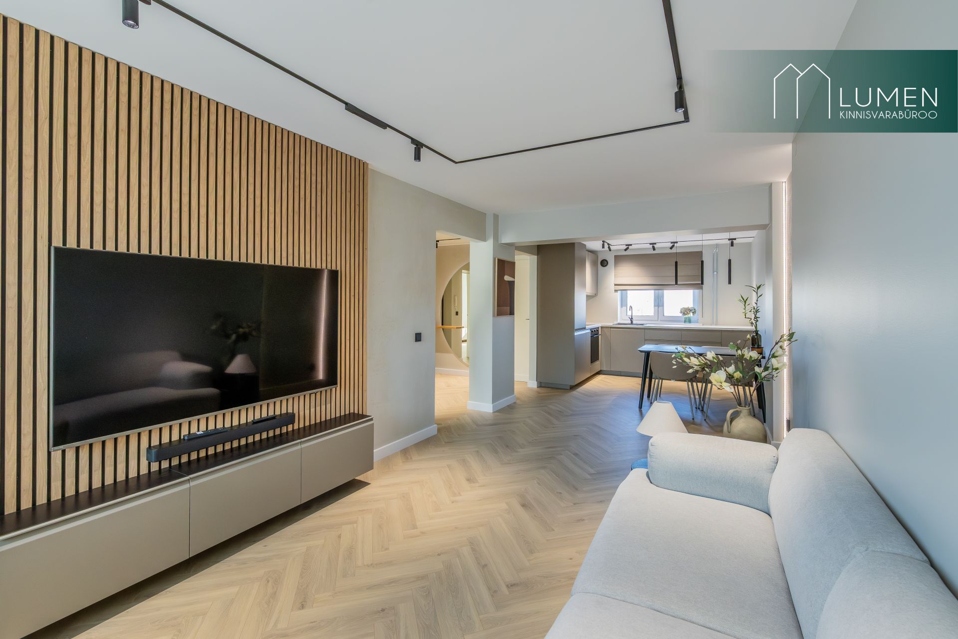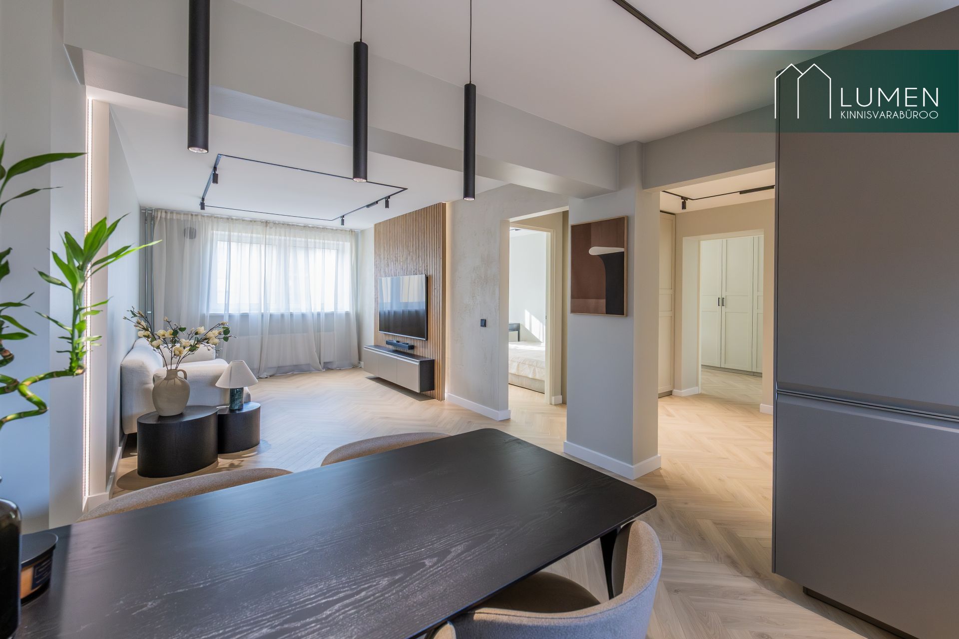 Korteri interjöör on loodud modernset elegantsi silmas pidades – naturaalsed toonid, kvaliteetsed materjalid ning minimalistlik, kuid soe disain loovad ajatu ja luksusliku atmosfääri. Avar elutuba koos köögiga moodustab kodu südame, kus suured aknad toovad sisse rohkelt loomulikku valgust ning rõhutavad ruumi avarust. Köök on kaasaegne ja funktsionaalne, varustatud integreeritud tehnikaga ning sobib ideaalselt nii igapäevaseks kasutamiseks kui ka külaliste võõrustamiseks.
