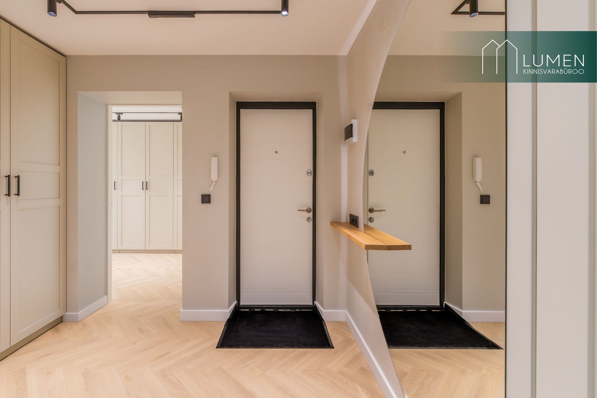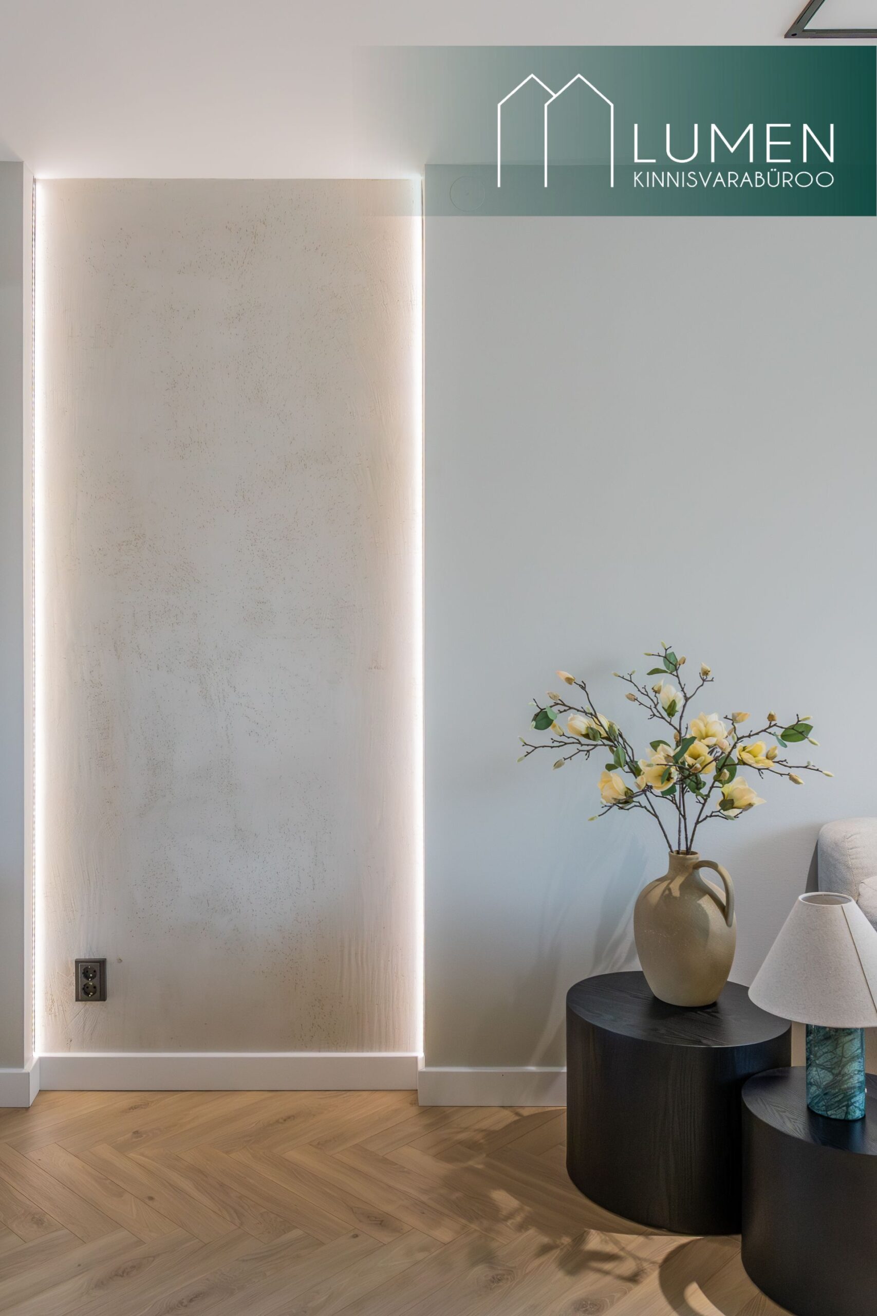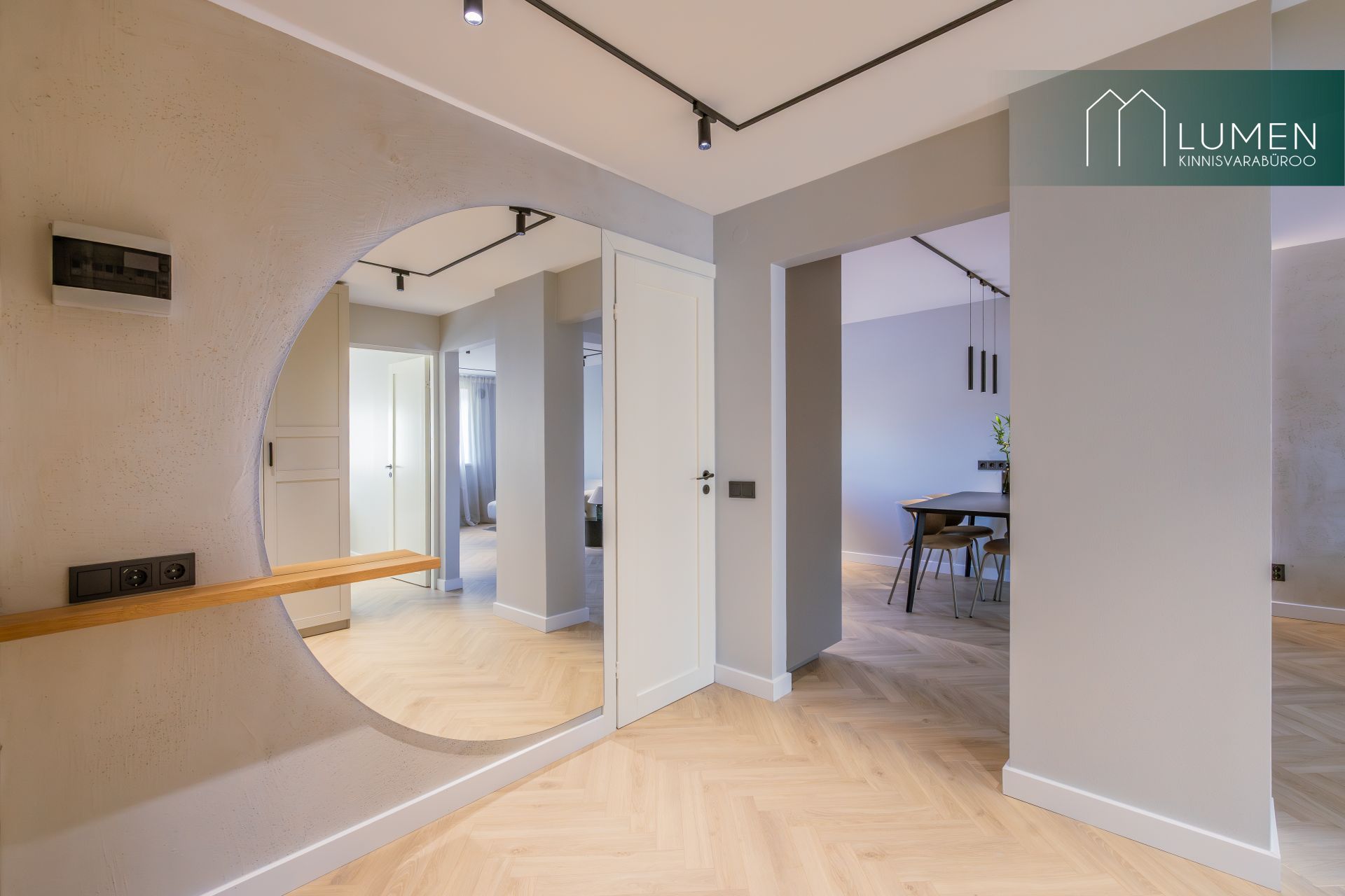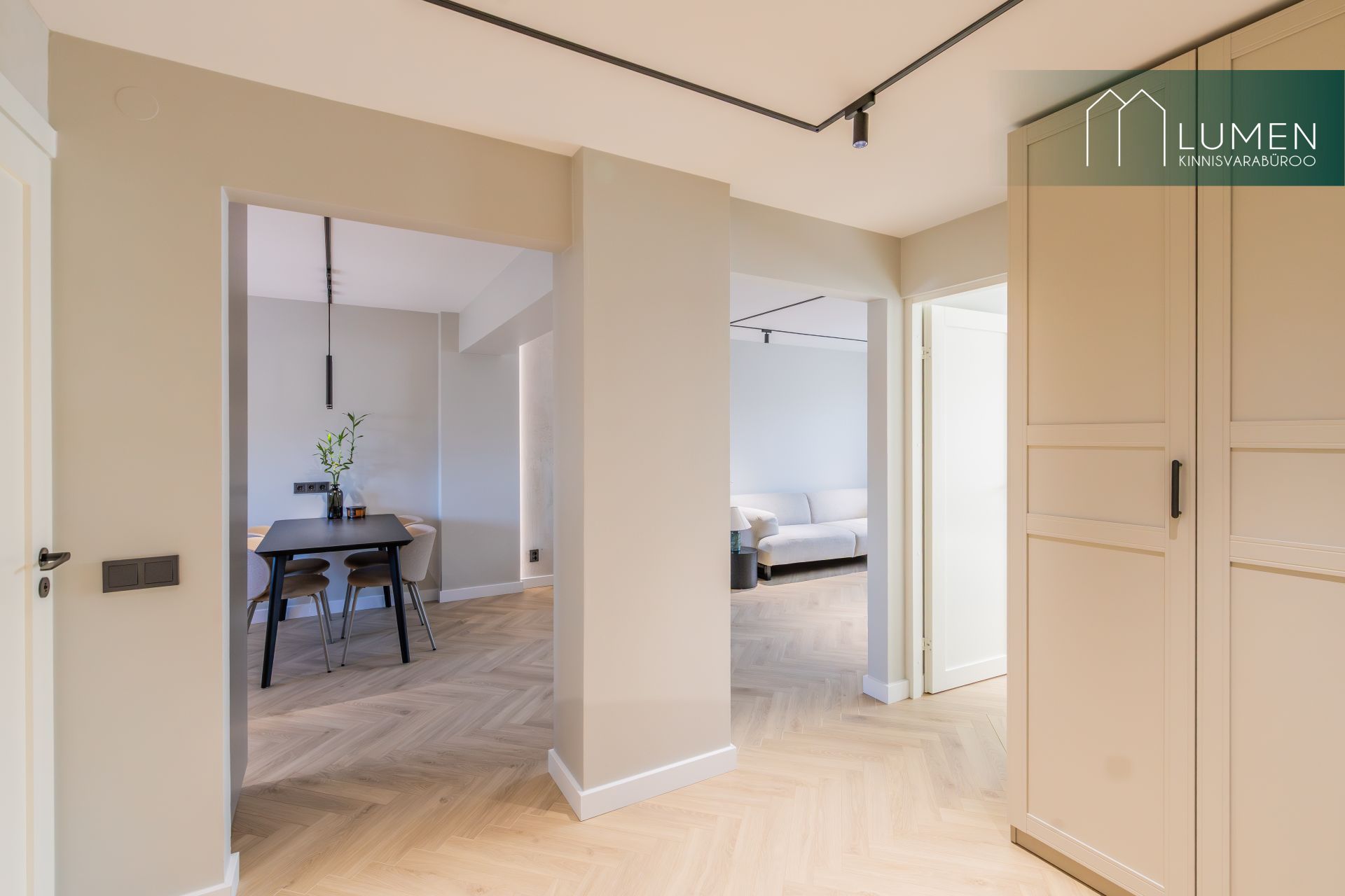 Korteri interjöör on loodud modernset elegantsi silmas pidades – naturaalsed toonid, kvaliteetsed materjalid ning minimalistlik, kuid soe disain loovad ajatu ja luksusliku atmosfääri. Avar elutuba koos köögiga moodustab kodu südame, kus suured aknad toovad sisse rohkelt loomulikku valgust ning rõhutavad ruumi avarust. Köök on kaasaegne ja funktsionaalne, varustatud integreeritud tehnikaga ning sobib ideaalselt nii igapäevaseks kasutamiseks kui ka külaliste võõrustamiseks.