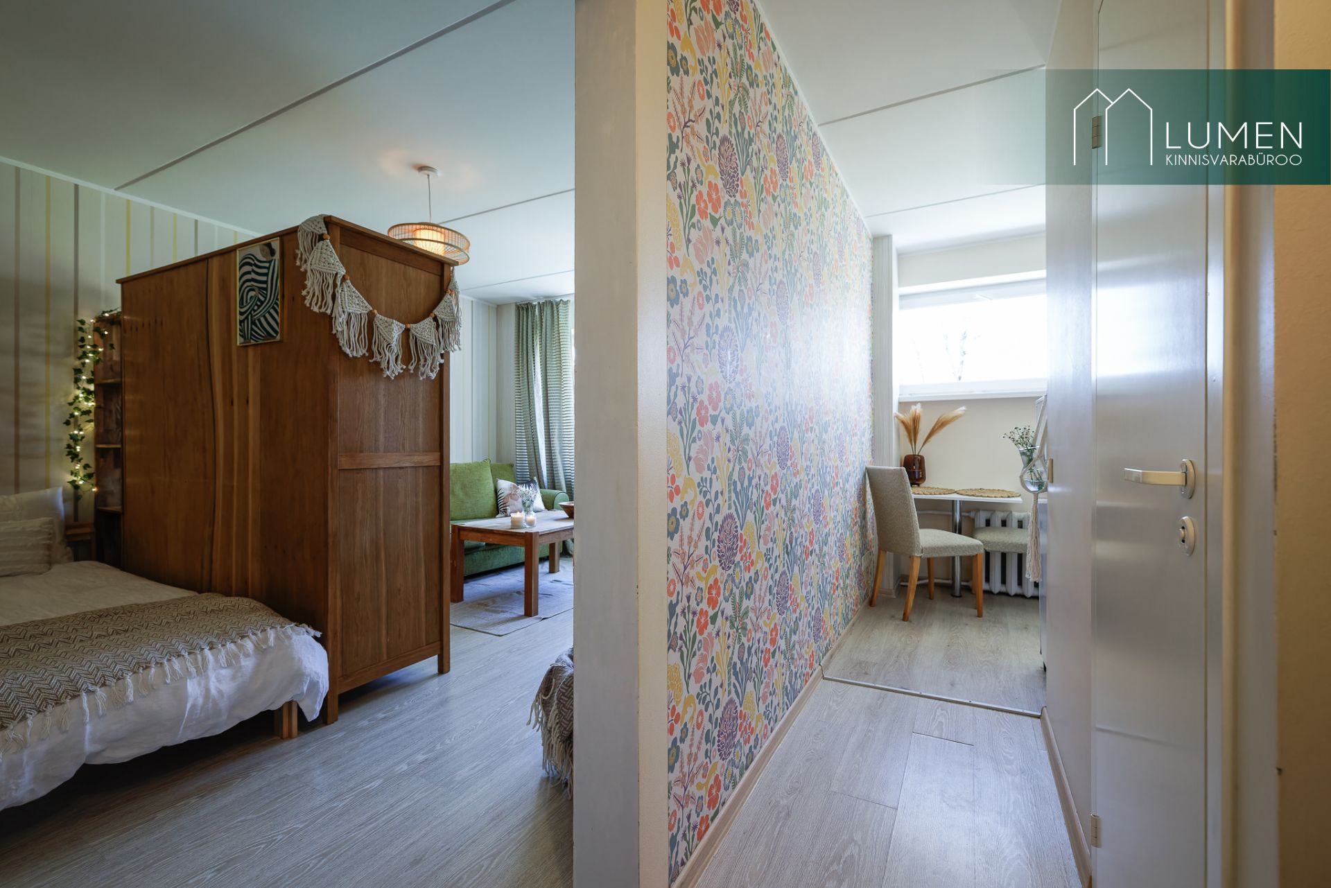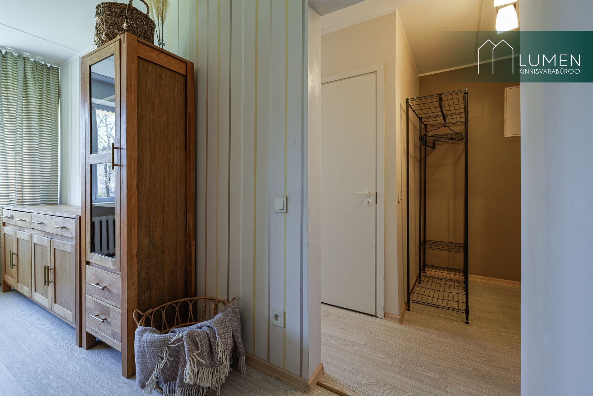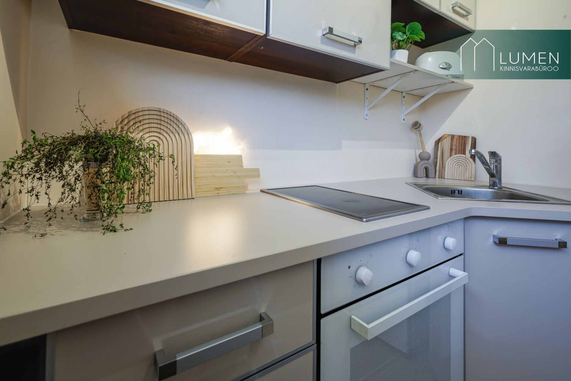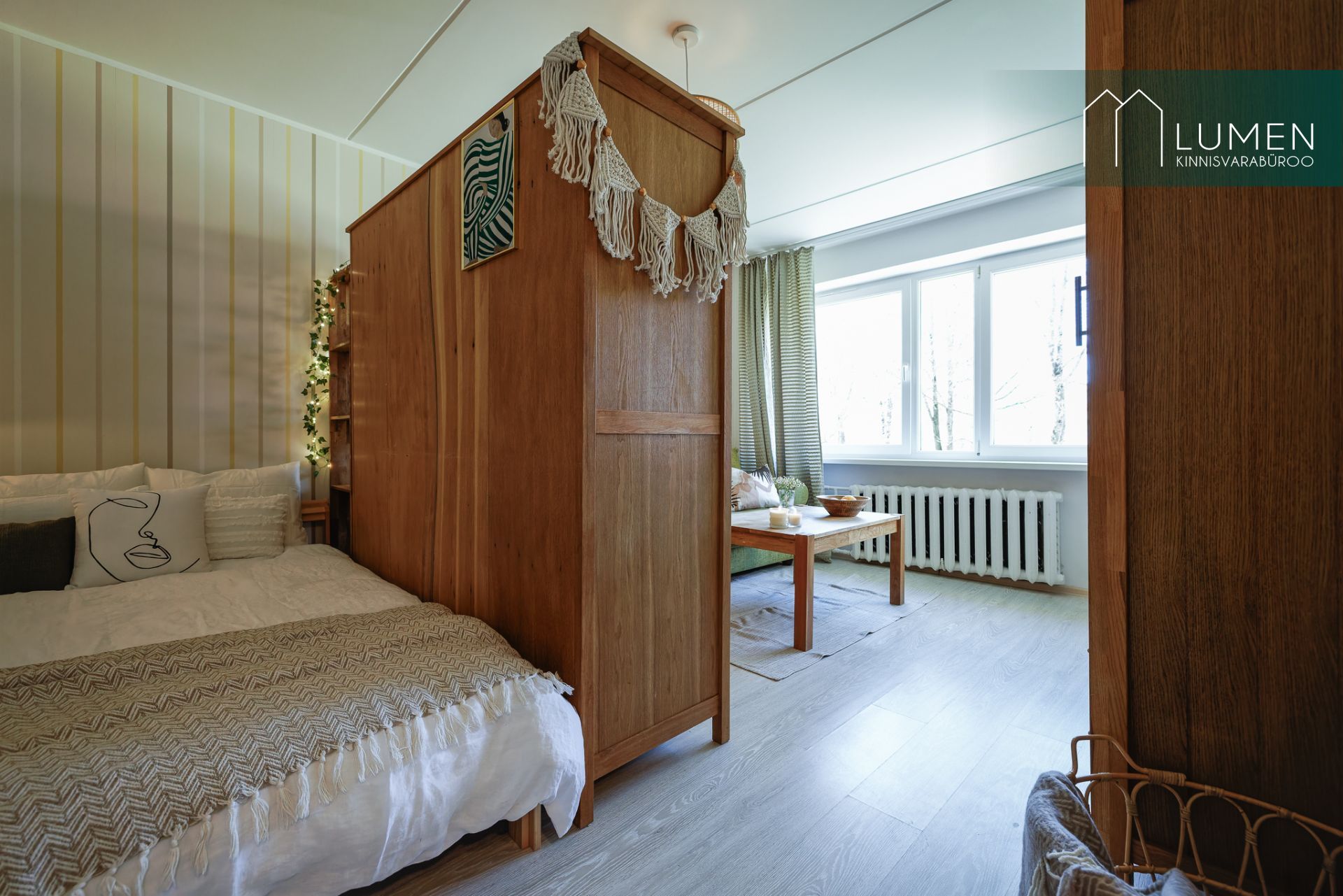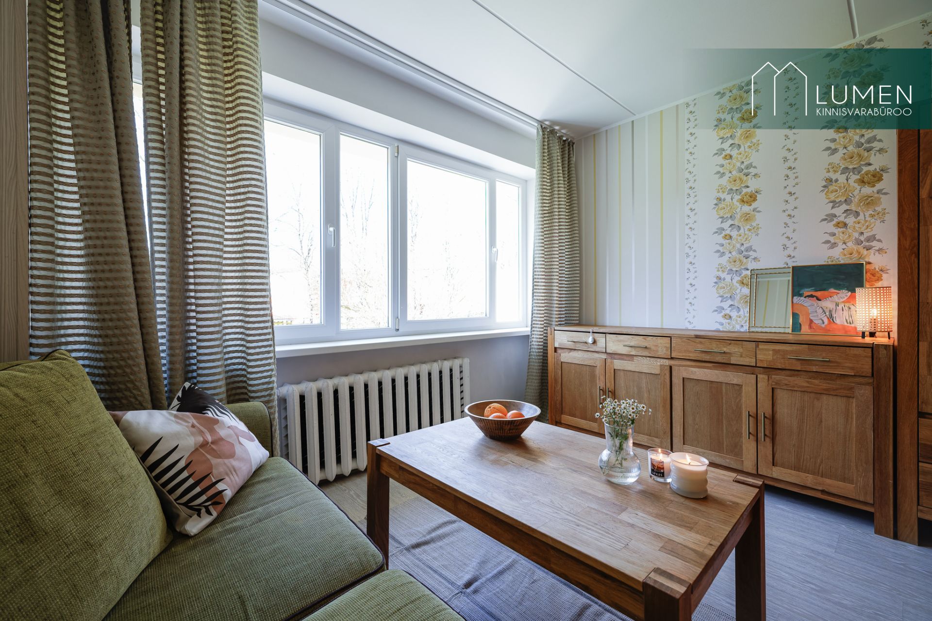 Üürile anda hubane ja valgusküllane 1-toaline korter (29,7 m²) esimesel korrusel. Korter on sisustatud heas maitses ning loob mõnusa koduse tunde: avar elutuba/magamisnurk, eraldatud köögiala ning praktilised panipaiga lahendused. Suured aknad toovad tuppa palju loomulikku valgust, avanevad maja taha ehk lääne suunal, ning heledad toonid koos puitdetailidega annavad interjöörile sooja ja rahuliku ilme. Köögis on olemas igapäevaseks toimetamiseks vajalik ning mõnus pisike sööginurk. Hoone on värskelt renoveeritud, soojustatud, ja saanud uue ilme.
