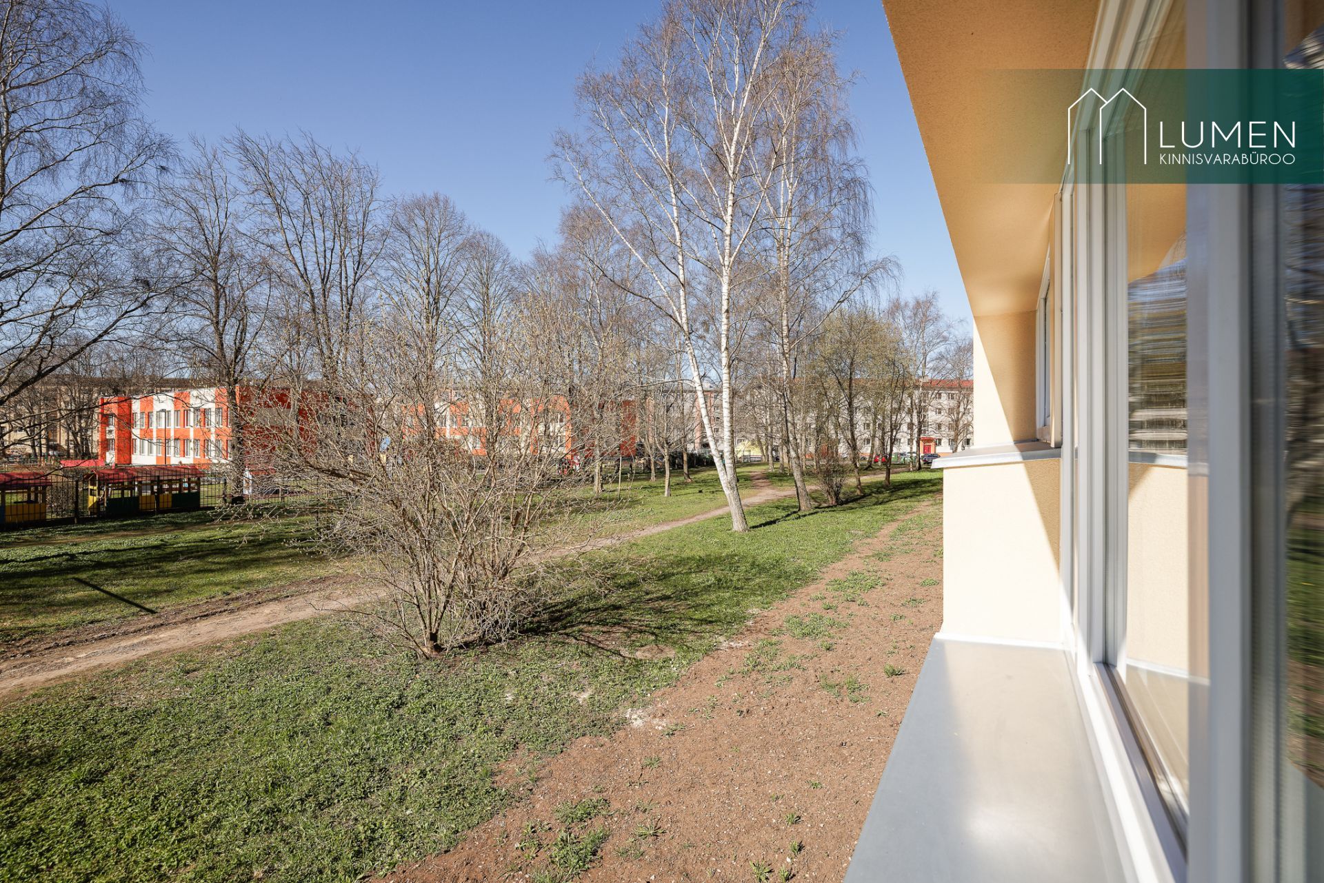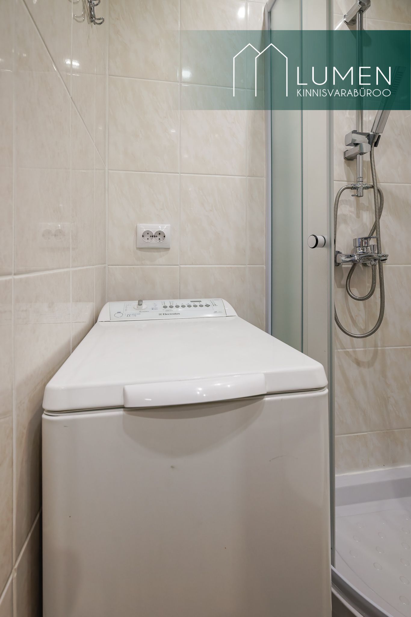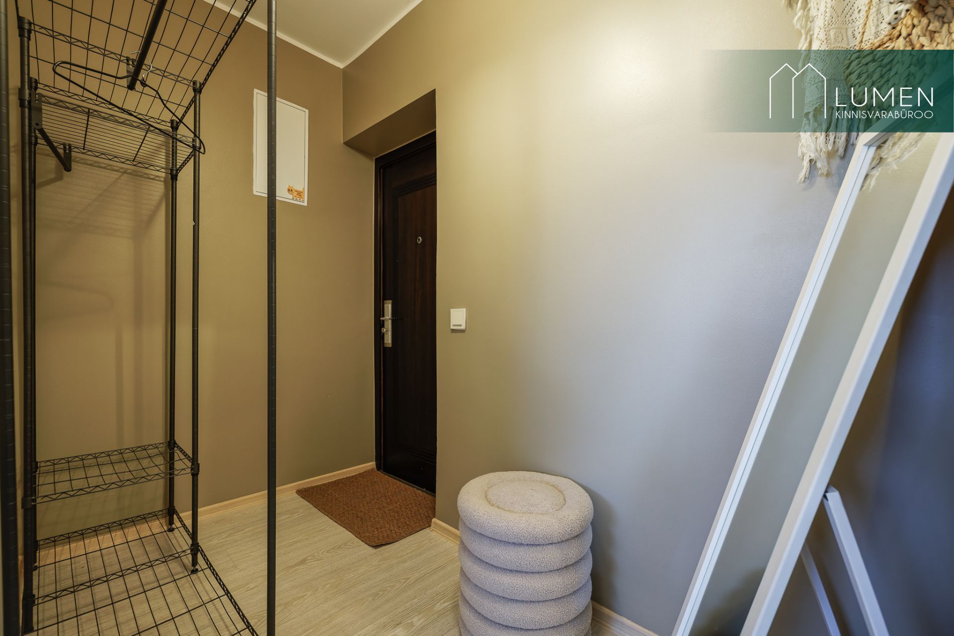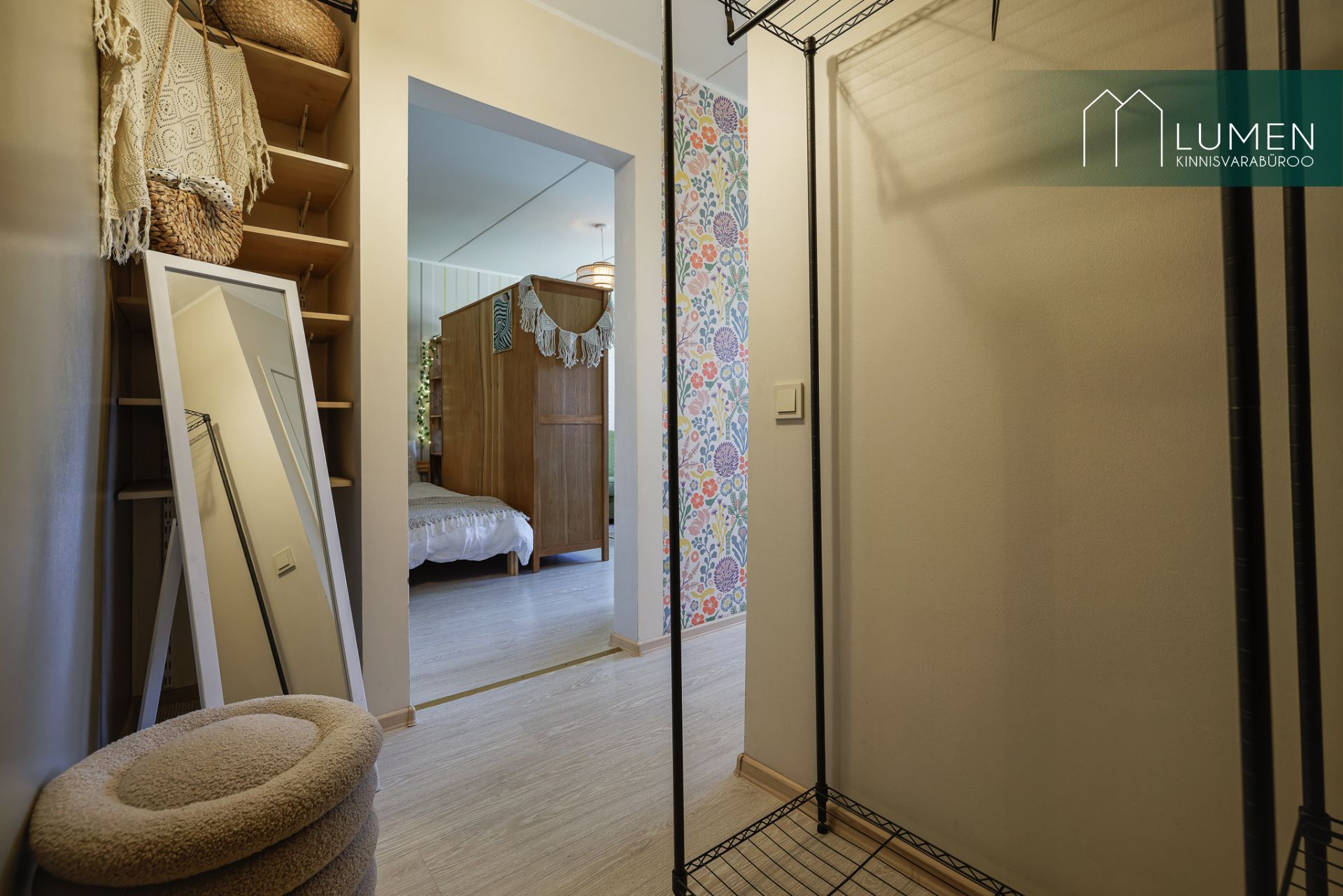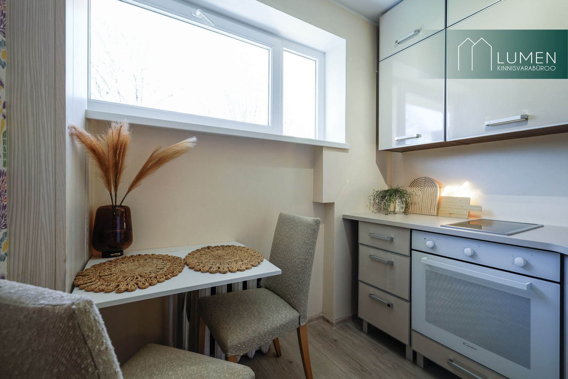 Üürile anda hubane ja valgusküllane 1-toaline korter (29,7 m²) esimesel korrusel. Korter on sisustatud heas maitses ning loob mõnusa koduse tunde: avar elutuba/magamisnurk, eraldatud köögiala ning praktilised panipaiga lahendused. Suured aknad toovad tuppa palju loomulikku valgust, avanevad maja taha ehk lääne suunal, ning heledad toonid koos puitdetailidega annavad interjöörile sooja ja rahuliku ilme. Köögis on olemas igapäevaseks toimetamiseks vajalik ning mõnus pisike sööginurk. Hoone on värskelt renoveeritud, soojustatud, ja saanud uue ilme.