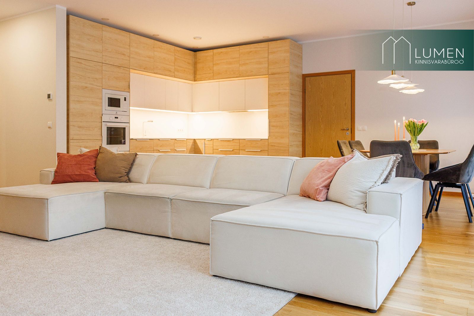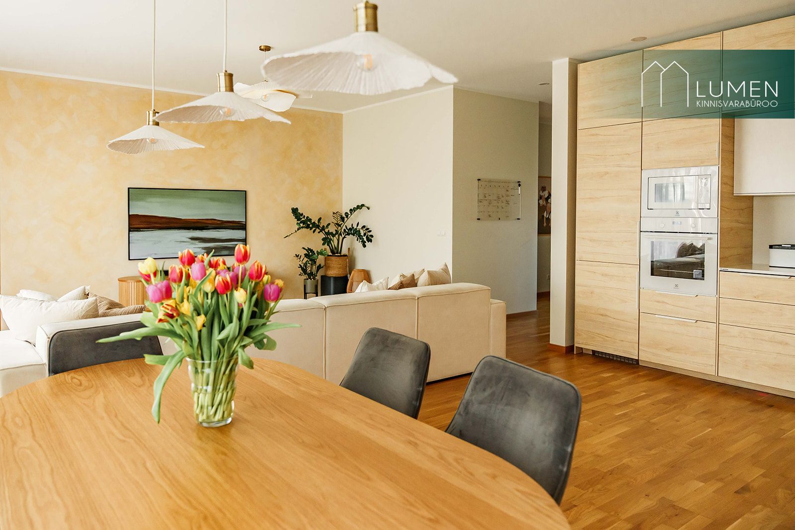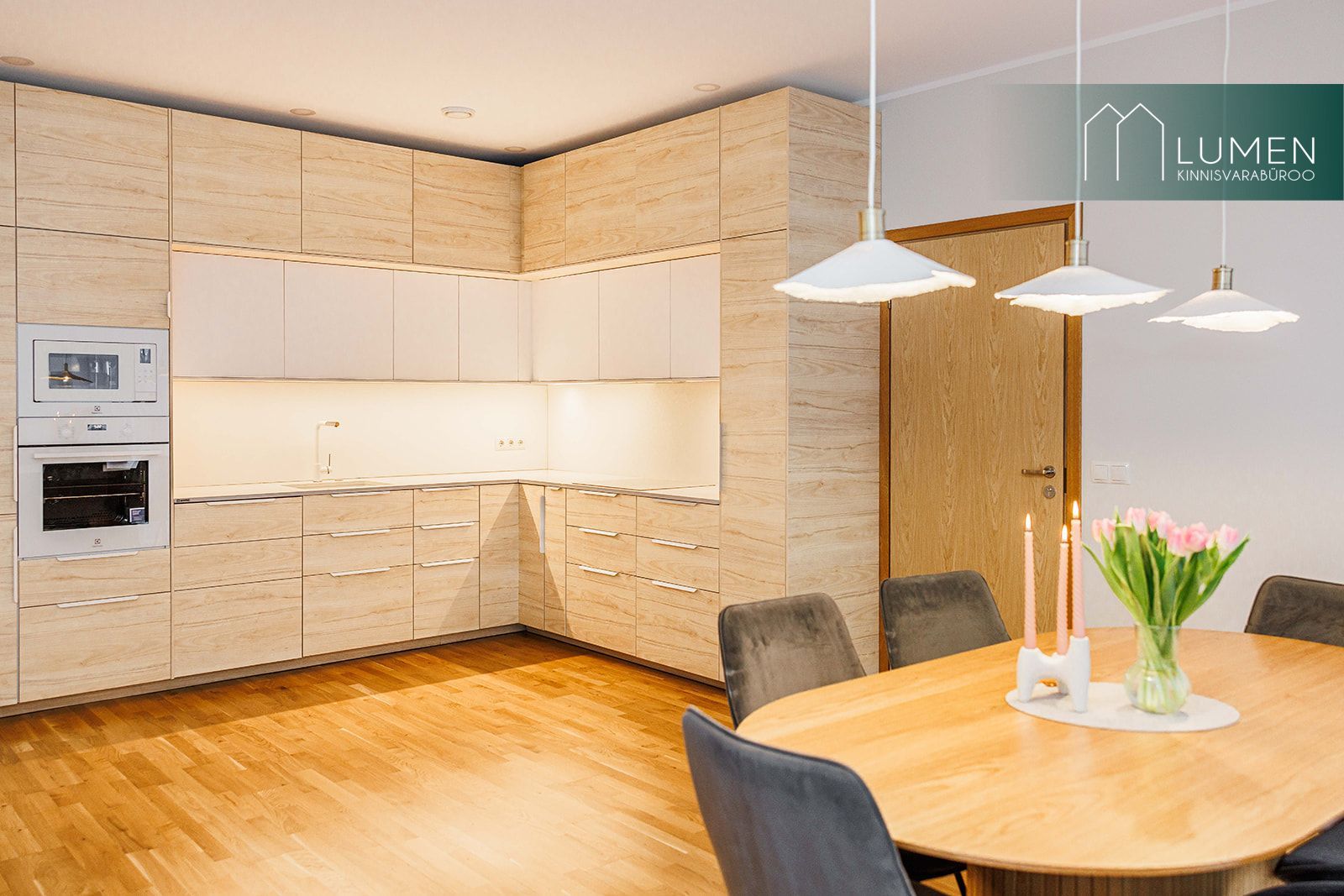 Köök on sisustatud valge Electroluxi tehnikaga. Töötasapinnaks on Granitopi kerge marmormustriga kvartskivi, mis on ühtaegu vastupidav ja visuaalselt elegantne.