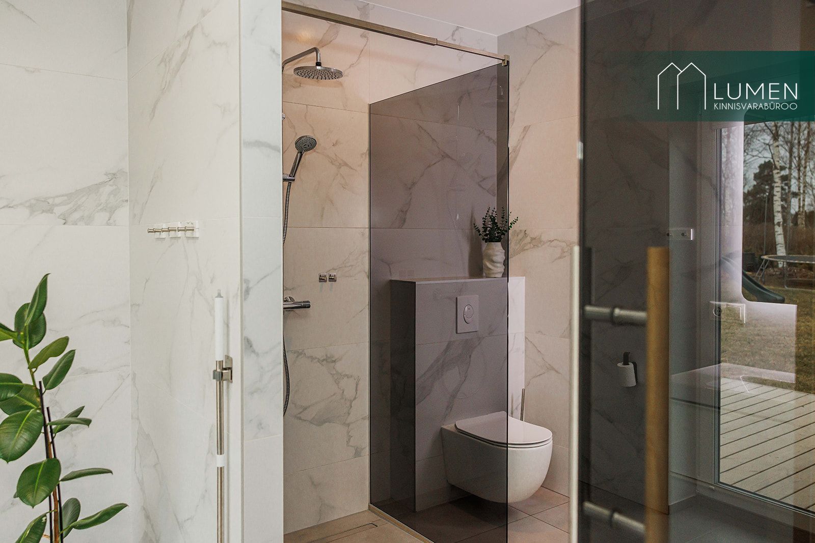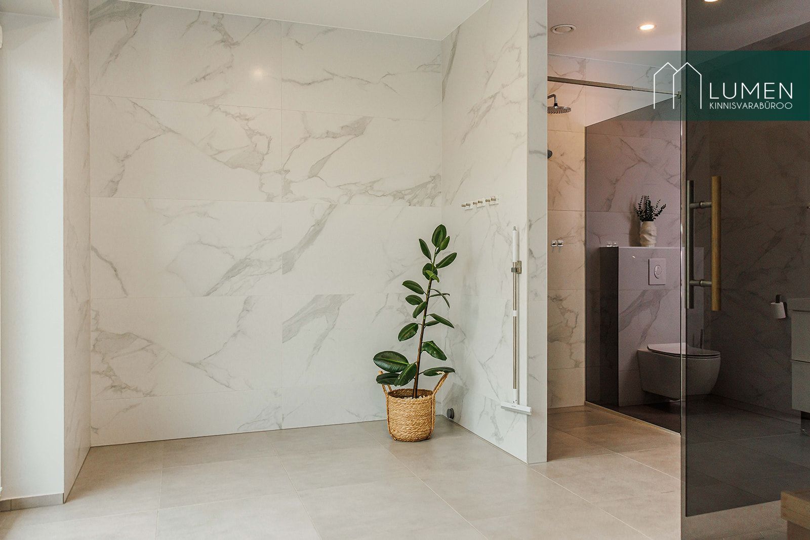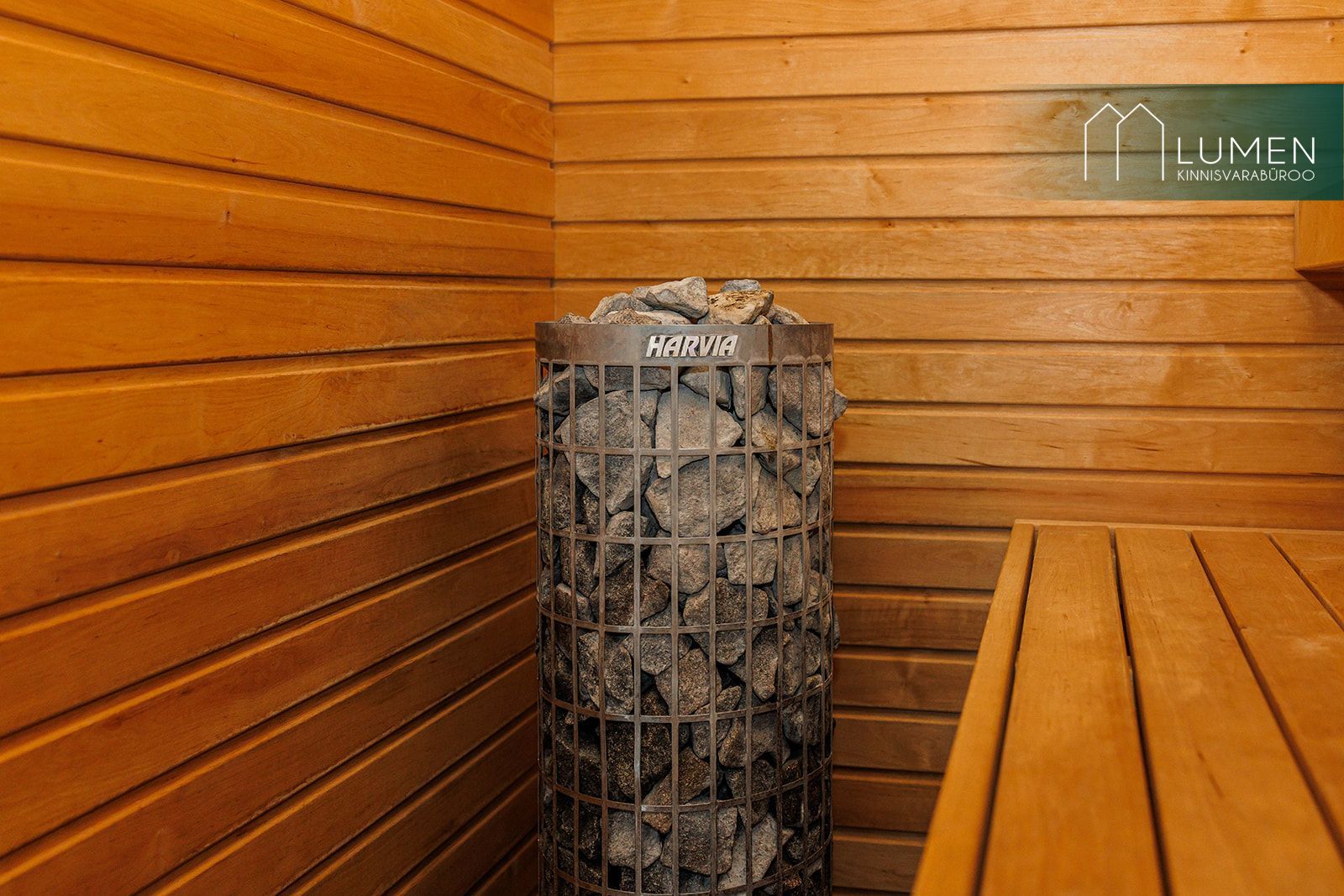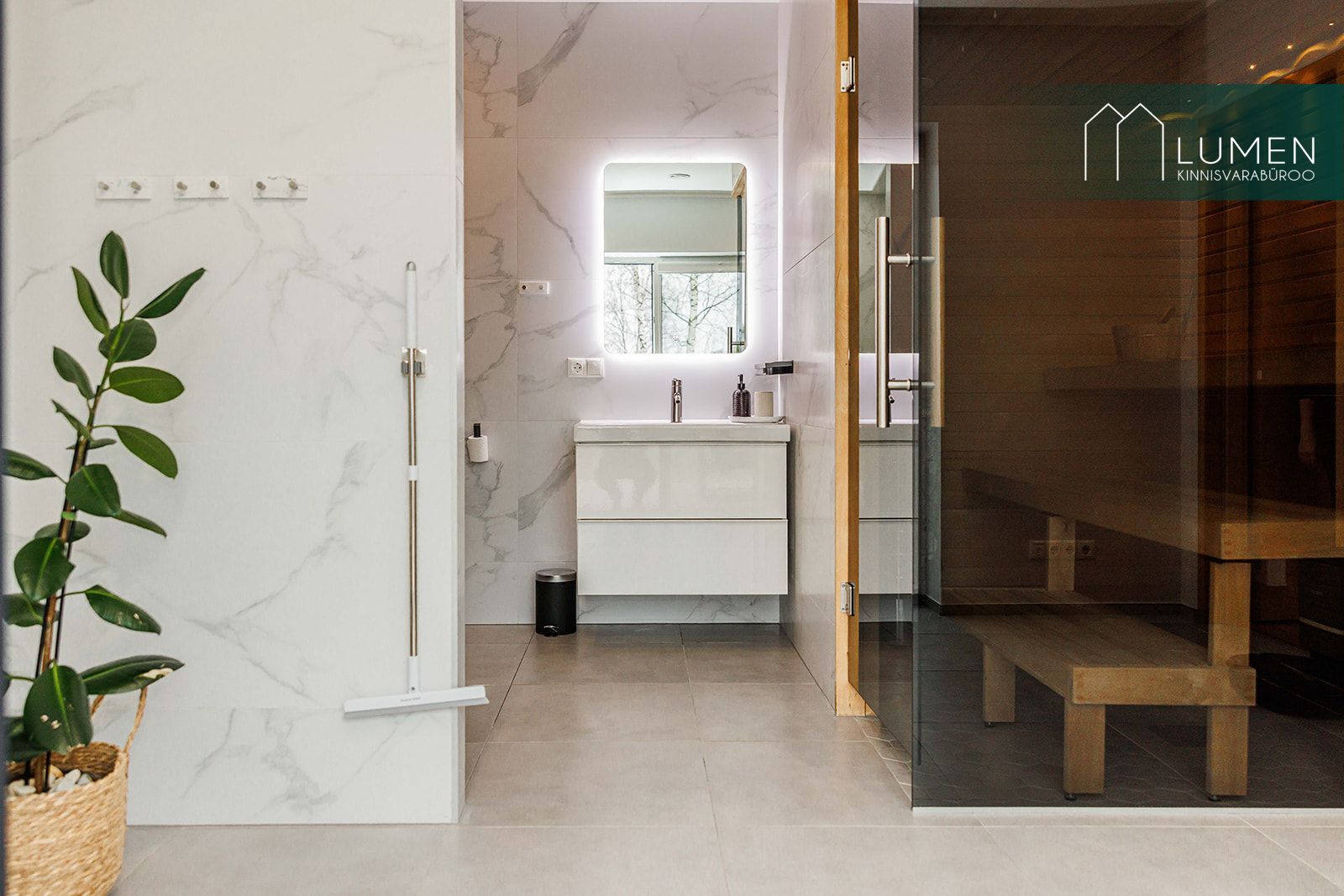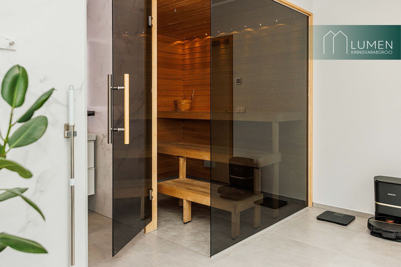 Avaras duširuumis paikneb ka saun. Sauna üks sein on täisklaasist ning sealt avaneb vaade maja taha ja terrassile. Pesuruumis on olemas ka vannivalmidus.