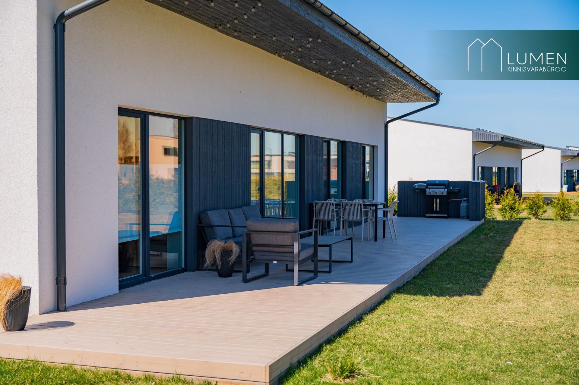 Maja juurde kuulub suur 40,3 m² terrass, kuhu pääseb kolmest kohast – elutoast, sauna eesruumist ja magamistoast. See teeb terrassist mugava pikenduse nii igapäevasele pereelule kui ka suvistele koosviibimistele.